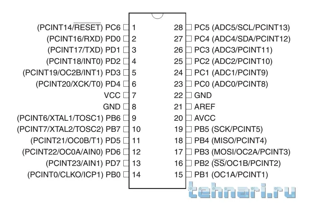 Эта ножка МК (впрочем, как и многие другие) является многофункциональной. Но в данном случае она использована под младший разряд порта ввода/вывода PB. Обратите внимание, она соединена через резисторный делитель с 15-й ногой (PB1), а его средняя точка идет на панельку с исследуемым радиокомпонентом.