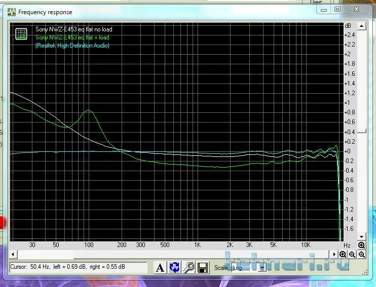 Не совсем понятен пик на 1 кГц и 2.5 кГц, не понятен обрез частоты на 10 кГц. Непонятна работа эквалайзера, что то совсем незаметны регулировки. Выход конденсаторный, виден горбик на 100 Гц при нагрузке наушниками.