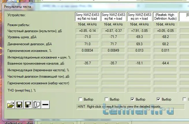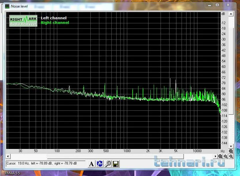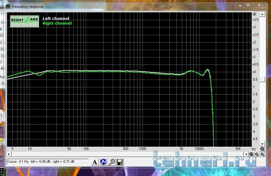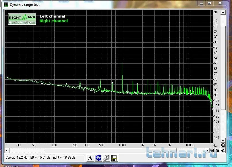 Встройке доверять в плане точности замеров искажений и шумов наверное нужно с оглядкой, но меня больше интересовала АЧХ и взаимопроникновение каналов в плеере. В качестве нагрузки выступали 40 Ом полноразмерные наушники.