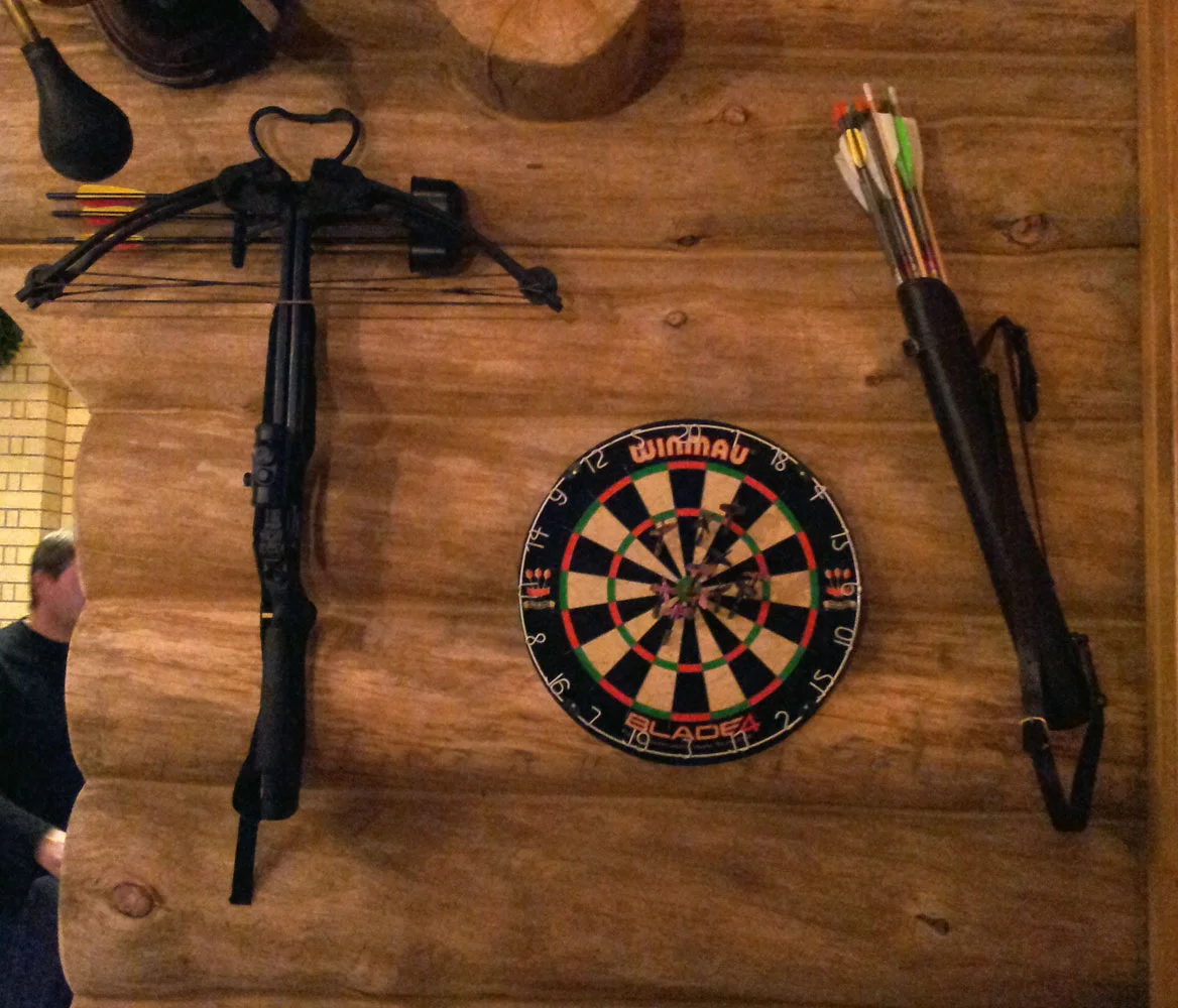 Дача полностью оборудована для полноценного мужского общества: есть бильярд, лук, арбалет, дартс и пневматические винтовки, то есть всё, что нужно взрослому, состоявшемуся мужчине.