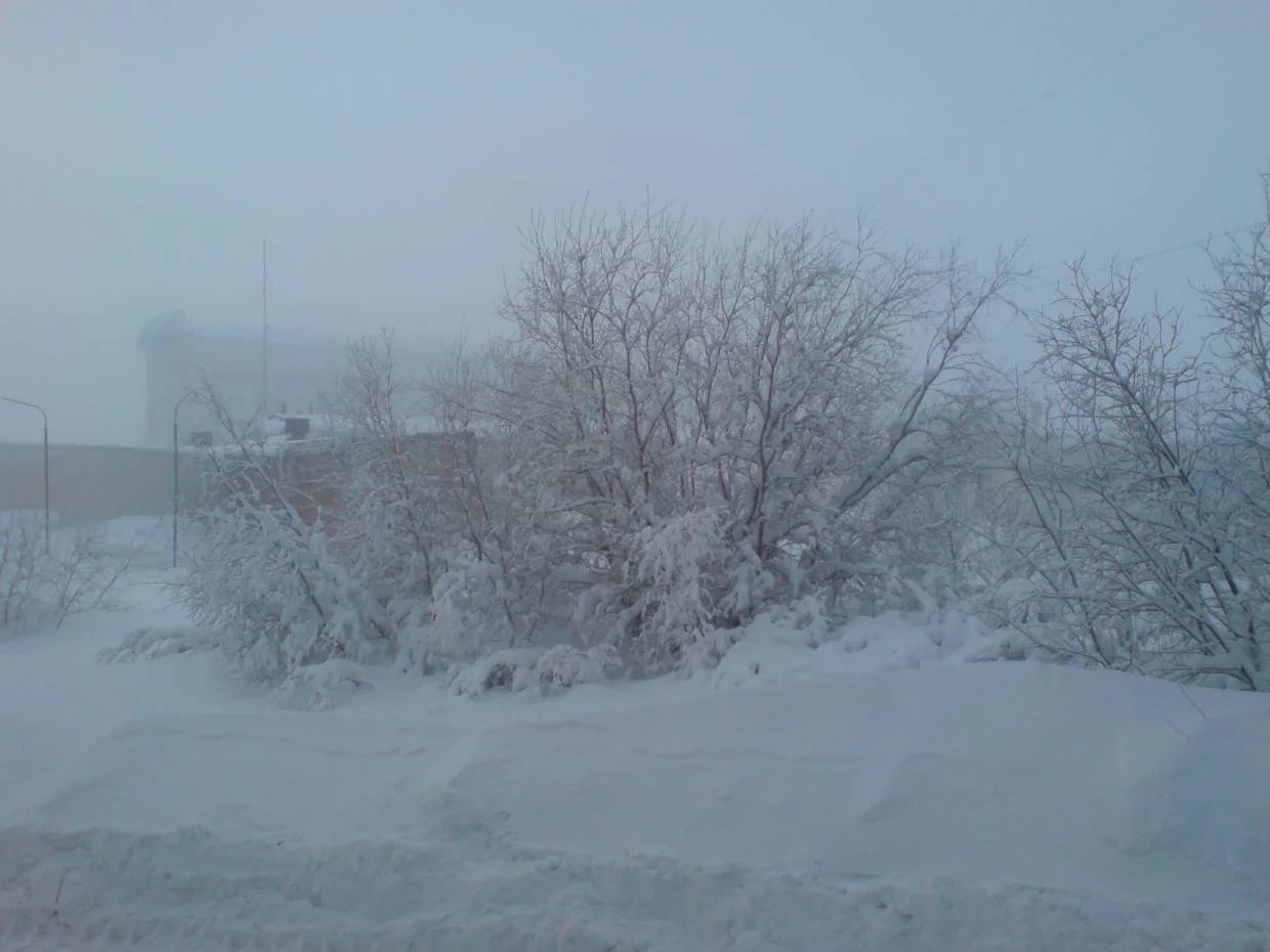 10.00 утра, за бортом -44 гЦ, от морозного тумана здание в 150 м еле видно. После обеда сфоткать не могу, потому как темно ... :D