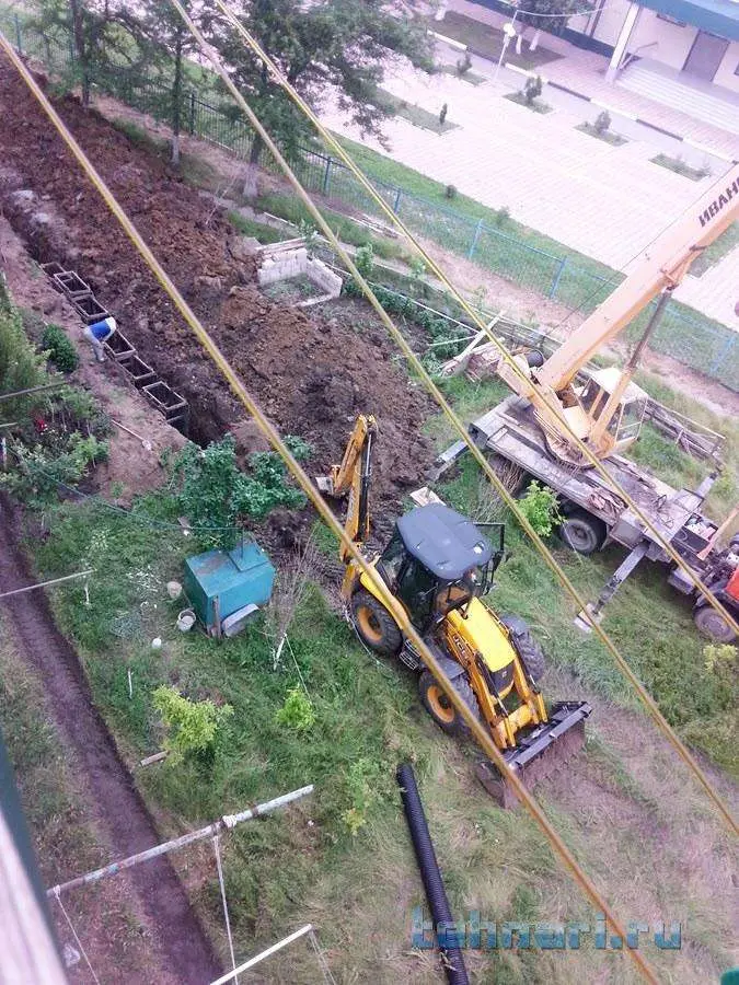 На заднем дворе нашего дома прокладывают дренажные трубы.
