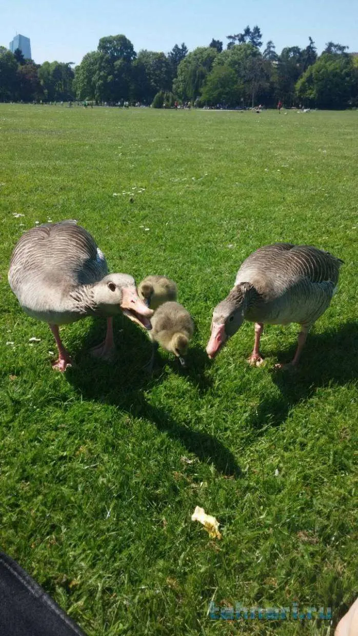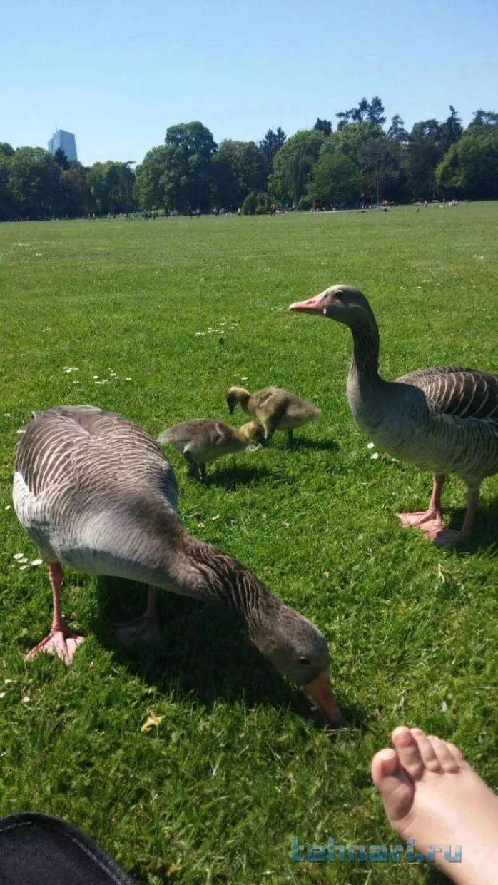 Репортаж с места. Хорошая погода, и мы пошли в парк полежать с пивом на травке.. Оказалось не только мы. Гусей - множество, гусята не боятся абсолютно. Но лучше не кормить - потом надоедают попрошайничеством.