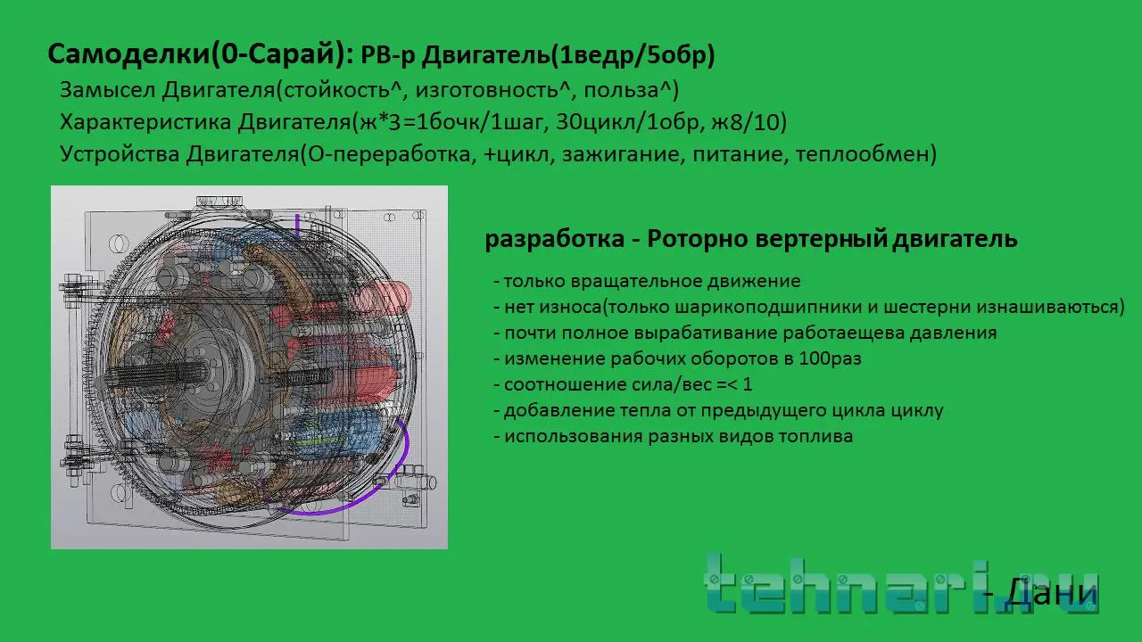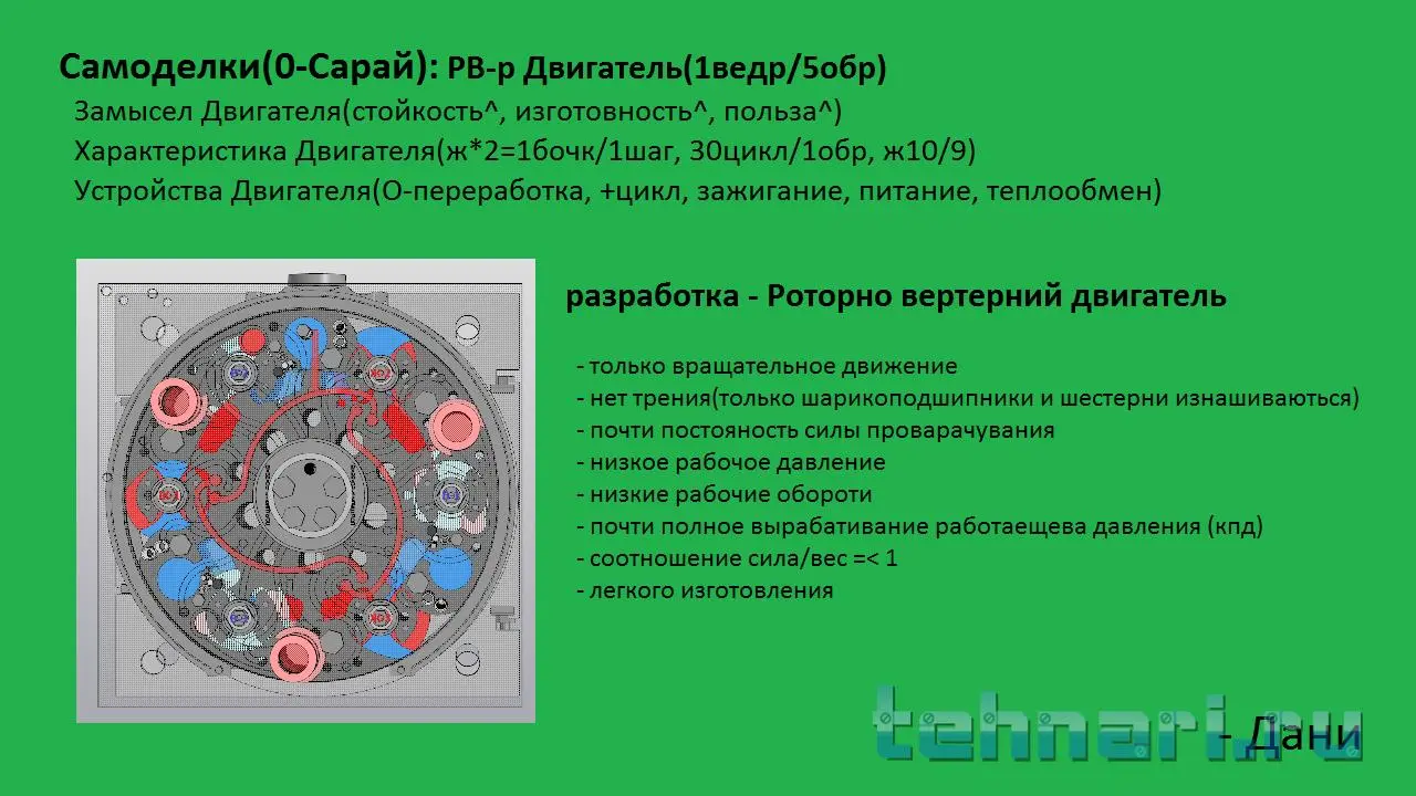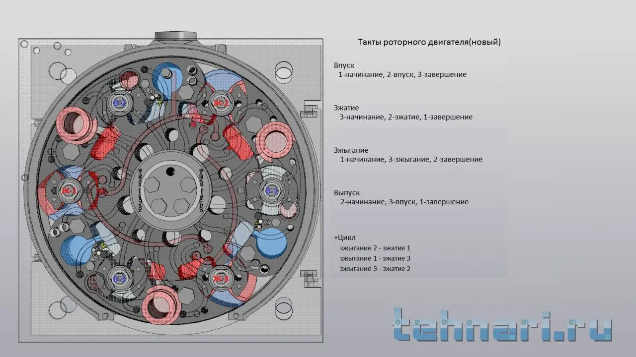 Я вот смотрю на вашу анимацию и не вижу в какой момент расширяющийся газ должен передавать импульс ротору, чтобы он вращался в нужном направлении. Отсюда у меня сомнения в работоспособности двигателя. Вы можете сделать хотя бы скриншоты моментов, когда газ расширяясь толкает ротор в определённом направлении, и когда он же отработанный выпускается наружу? У роторного двигателя, как и у поршневого, присутствуют такты, вот и изобразите схематично отдельно каждый из этих тактов.