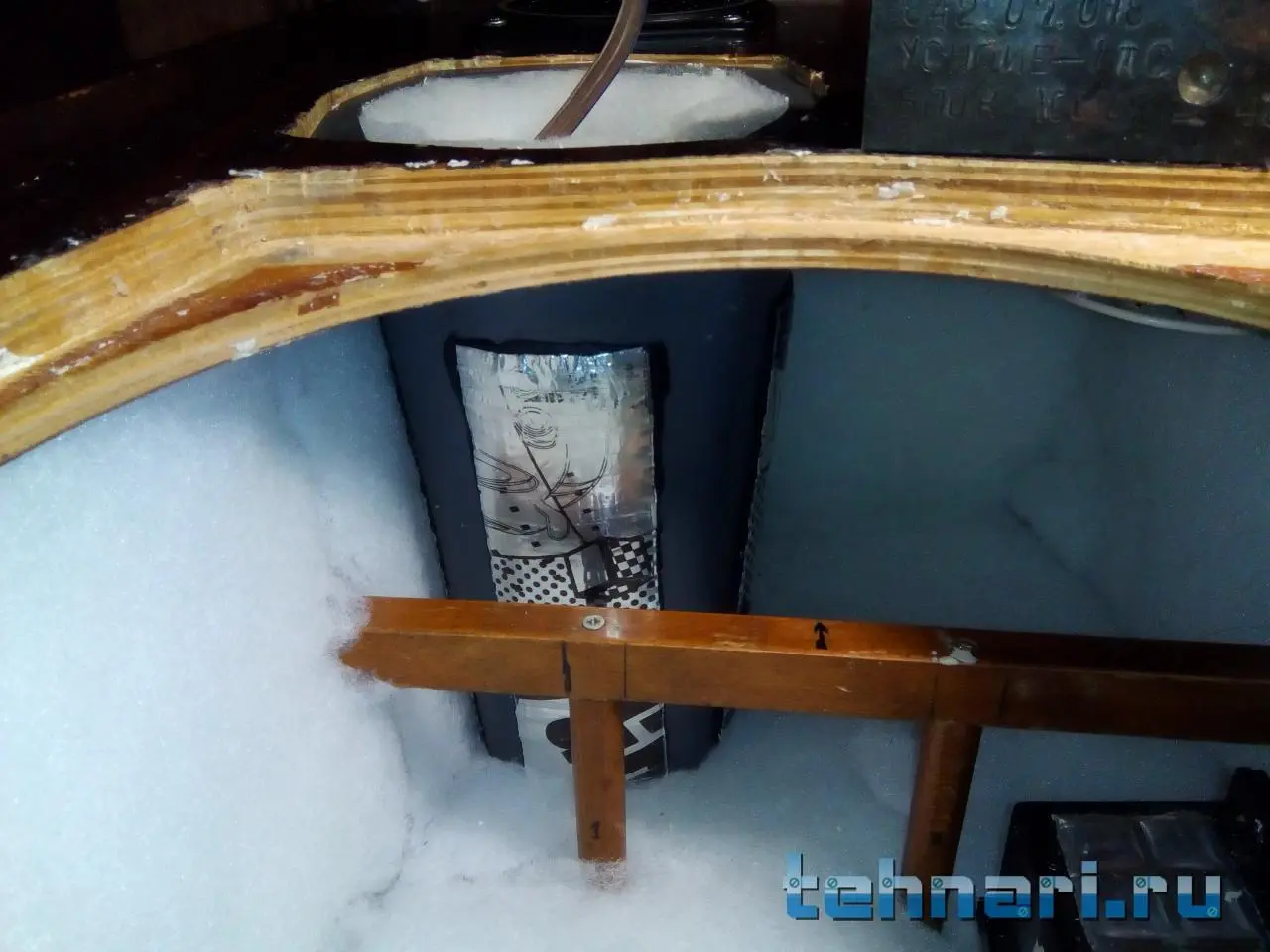 Да, штатный. Обклеивал полосами вибропласта (вроде бы так называется) для авто 2,5мм. Внутри демпфирующий материал Visaton Damping Material. И немного распушённой ваты.