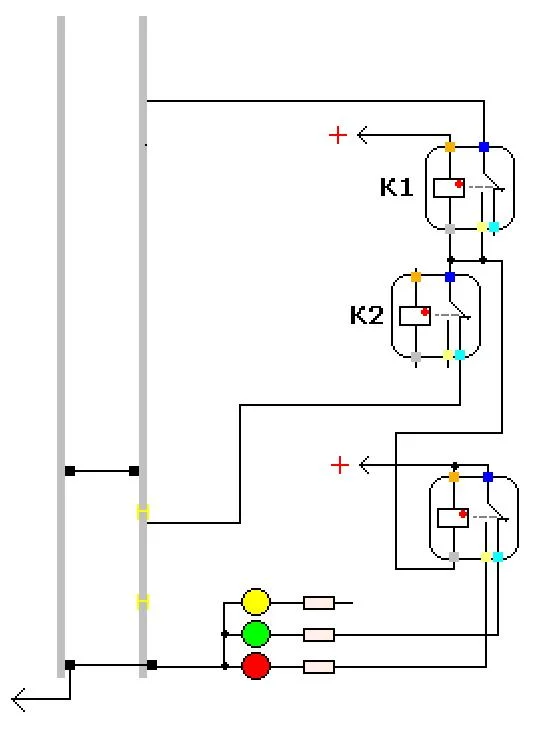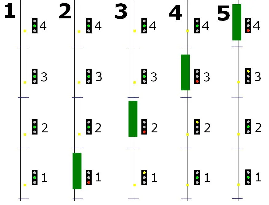 поезд проезжает светофор 2 и теперь уже на нём загорается красный сигнал, одновременно загорается желтый сигнал на светофоре 1,