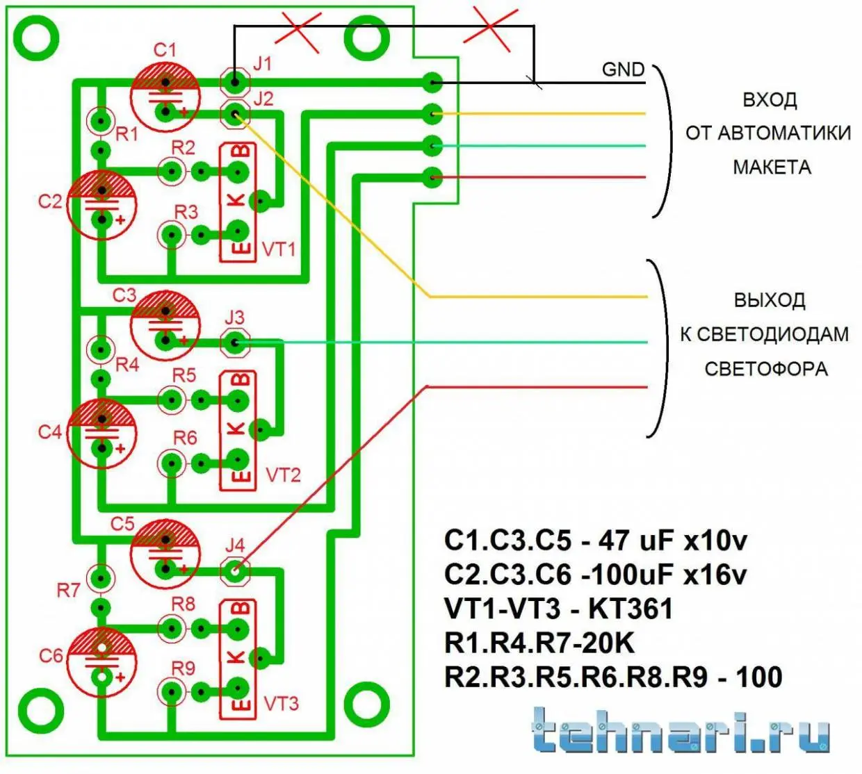 Попробовал расчертить платку) вот что вышло, добавил сопротивления на базу и эммитер,как советовали.....здесь я схемку объединил под 3-х значный светофор.