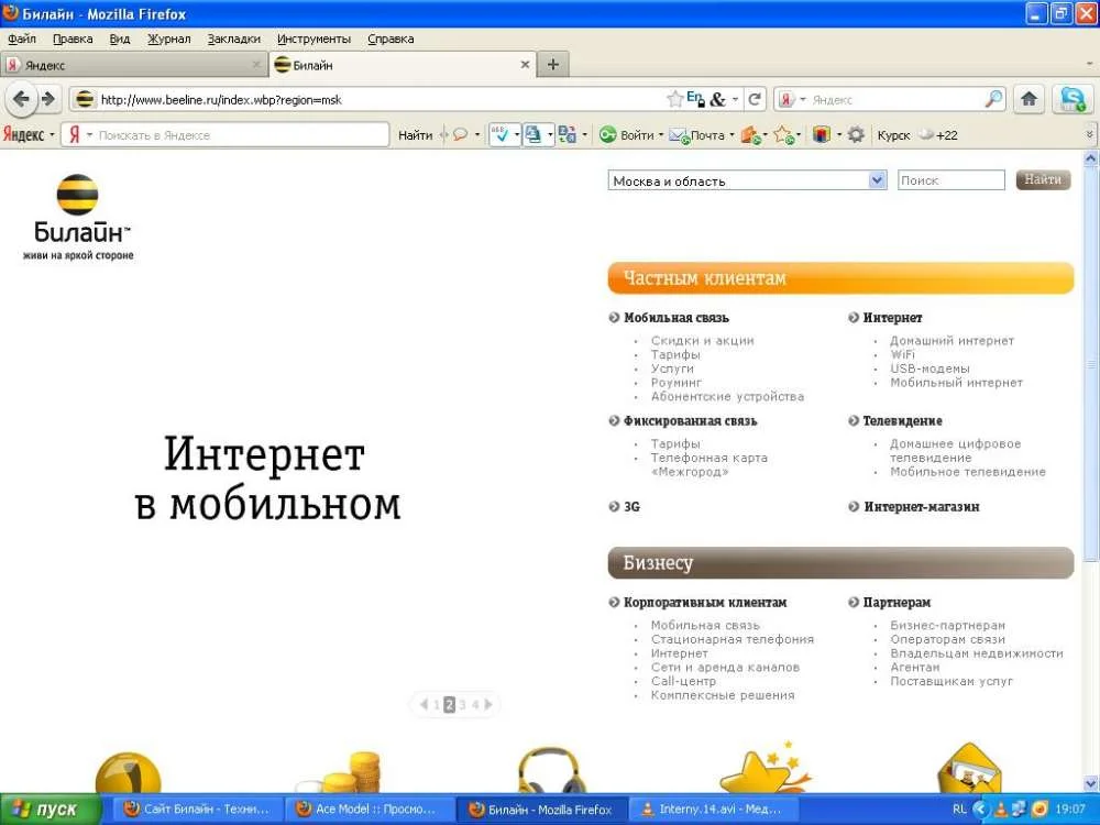 Так, немного начинаю вспоминать: Я скопировал профиль Мозиллы с другого компа. Там стоял прокси и на нем сайт Билайна не работал (не знаю почему, с некоторых других провайдеров на другие не заходит). Может в этом дело? Где-то в запрете прописался? Хотя ведь через експлоер тоже не заходит, не знаю в чем ещё проблема может быть?