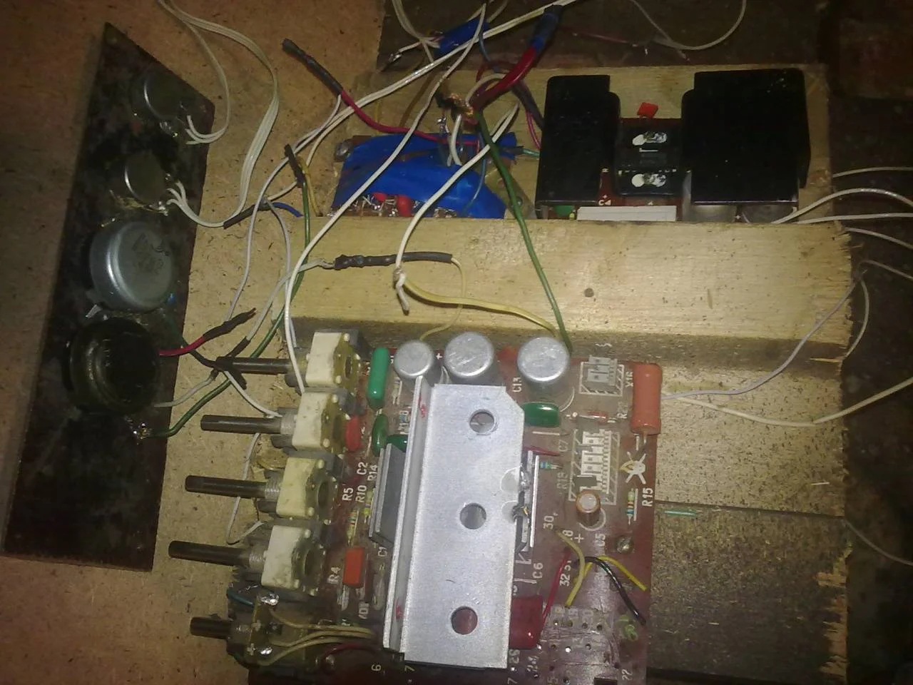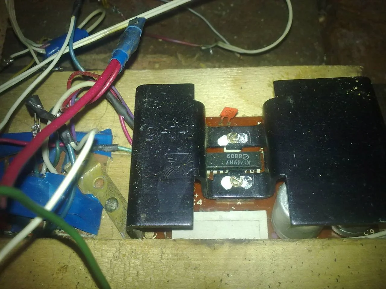 Аудиосистема, если её можно так назвать.. Собрана она на двух микросхемах К174УН7, одна из них идет на сабвуфер.. Системки вполне хватает на обслуживание помещения площадью в 50 кв. м.. Конечно микруха не очень мощная, но зато в отличии от некоторых аналогичных ТДА-шек практически не шумит!