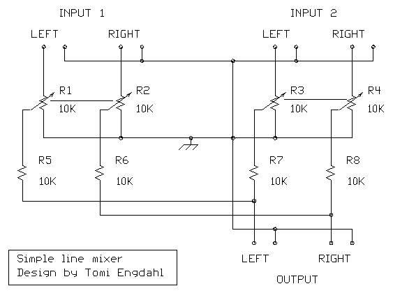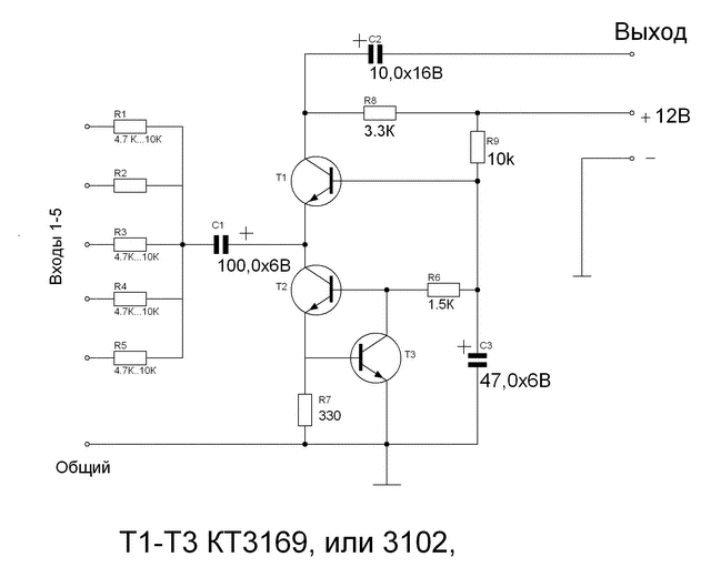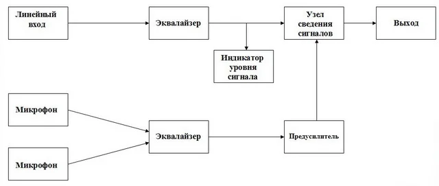 Появилось желание собрать несложный микшер. Нужен он мне для суммирования сигналов с 2х микрофонов и линейного входа. Я нарисовал блок-схему, если что-то не так, то исправьте. Эквалайзер хочу собрать на микросхеме BA3822LS или сделать простой тембрблок. Индикатор уровня входа на микросхеме AN6884. Предусилиетль на транзисторах КТ3102Е(Д). А вот как собрать устройство суммирующее сигналы я не знаю..