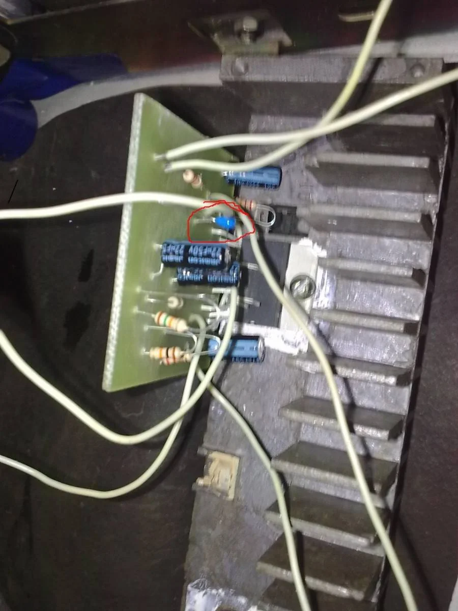 смотрите на фото выделен резистор он случайно не соприкасается с радиатором? И конденсаторы не должны касаться корпусами радиатора