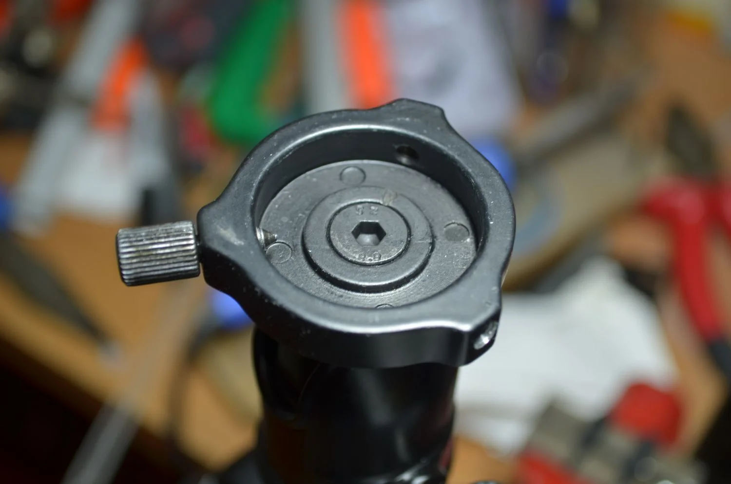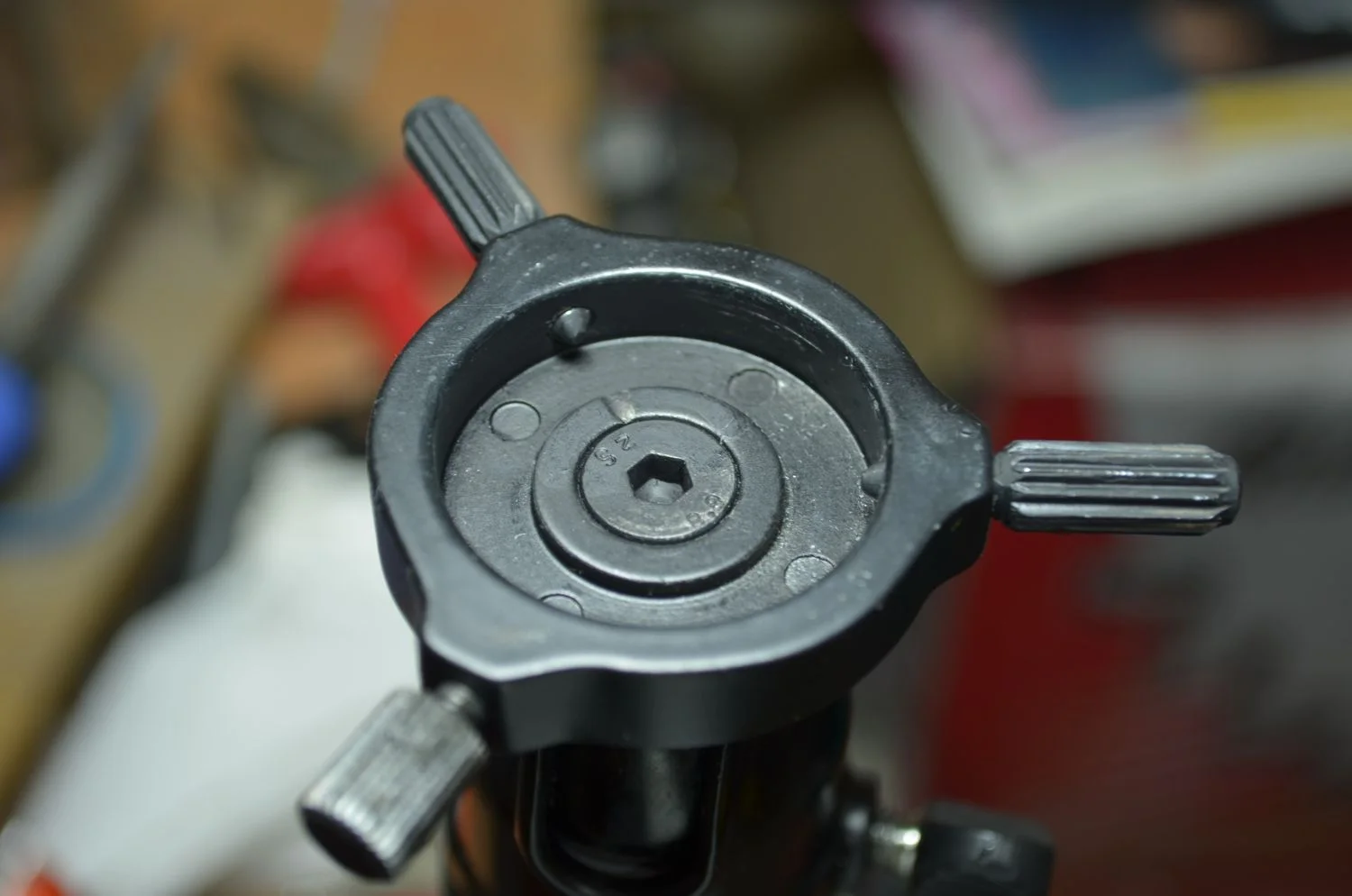 Ну это не назвать прямо ФОТО примочкой, но вот так я решил вопрос с жесткой фиксацией фотоаппарата на штативе, а то на одном родном зажиме он несколько покачивался - теперь все идеально. (попадется третья такая фигня медельная и родной винт заменю)