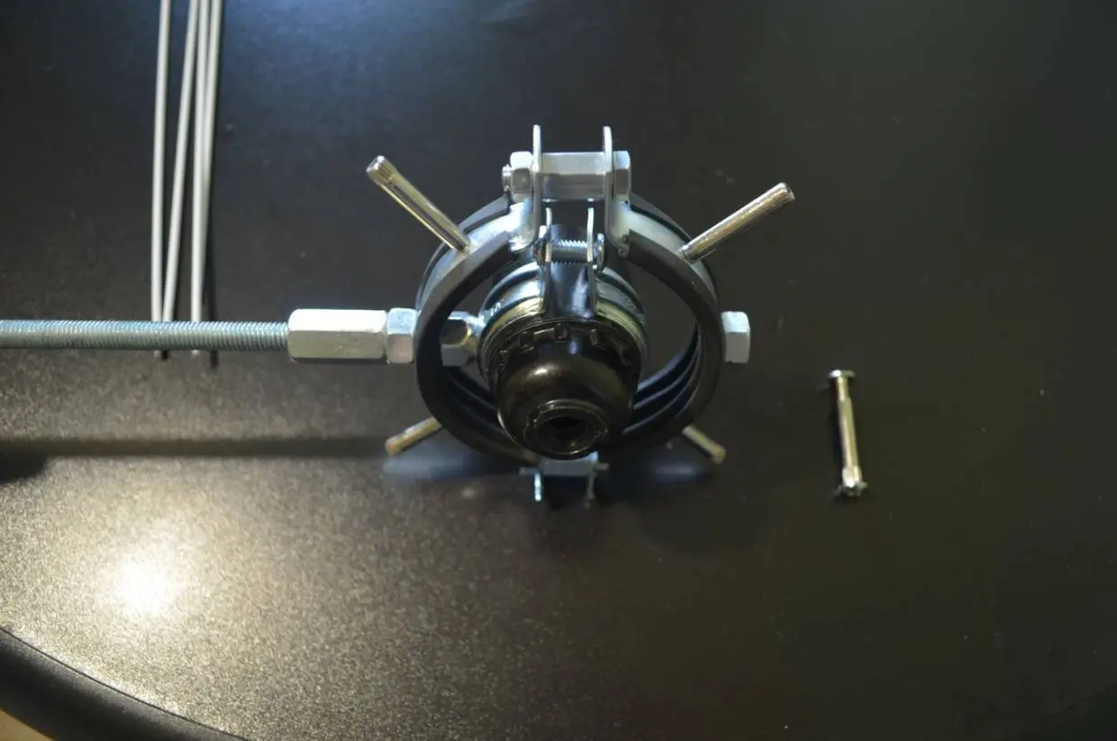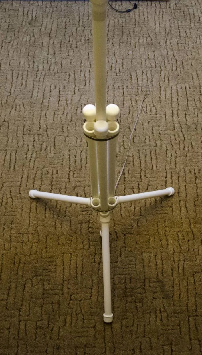 Штатив смастерил из ПВХ труб, сваривал их с помощью строительного фена. Получилось немного не ровно вверху (рогатуля которая держит обод) но задачу свою выполняет :)