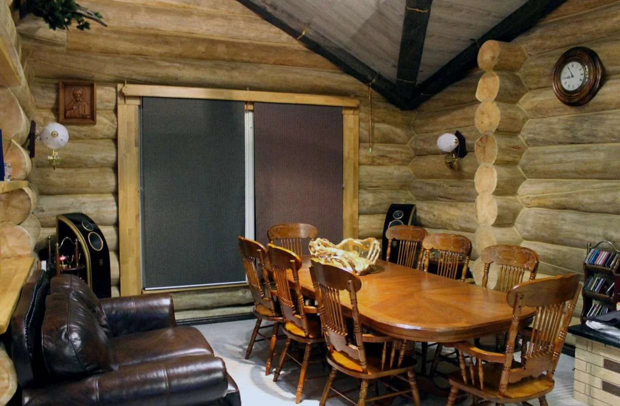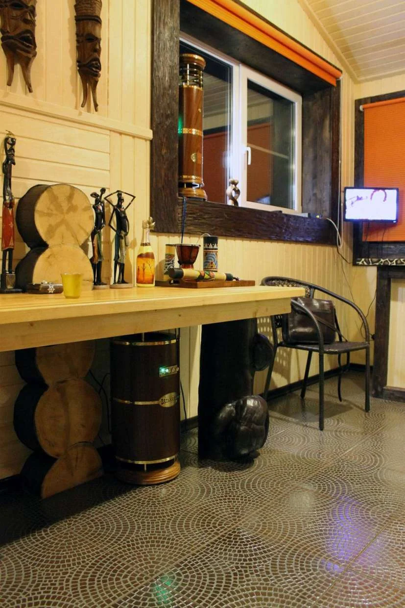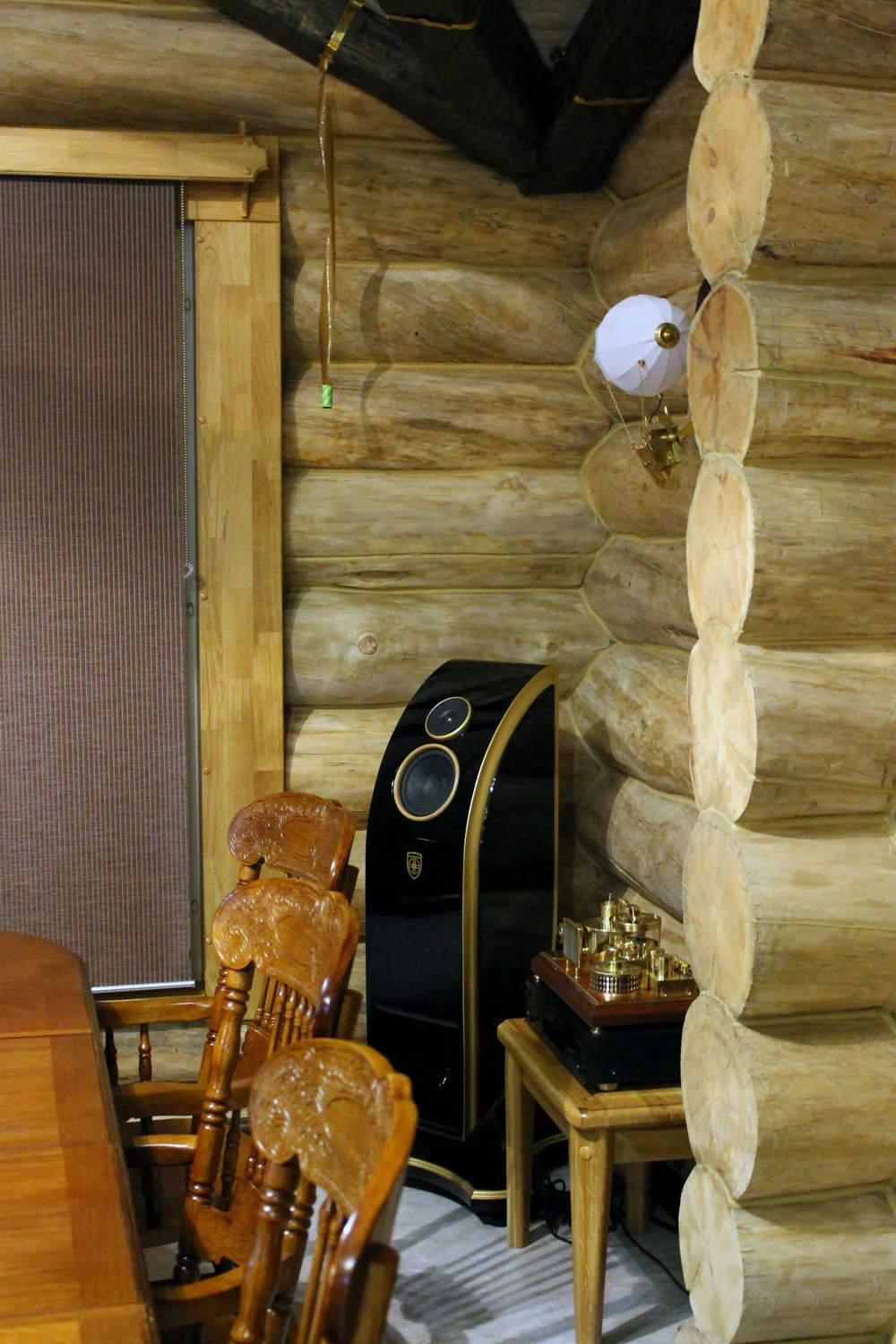 Из банного помещения видна веранда с новым комплектом музыкальной аппаратуры.