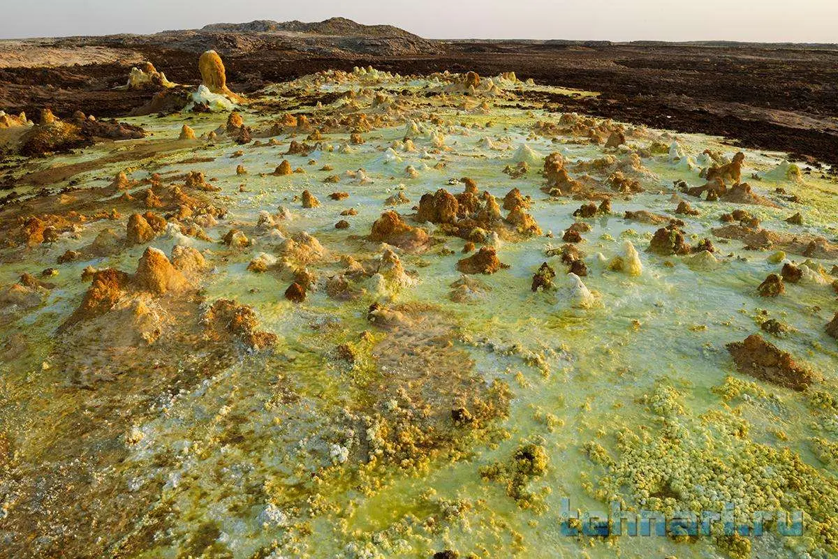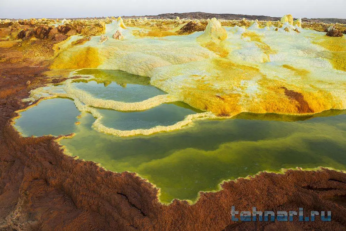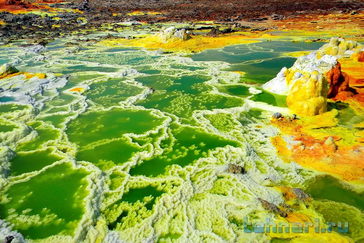 Впадина Данакиль — это вулканическая область, которая простирается от вулкана Даллол до озера Ассаль, недалеко от границы Эфиопии с Эритреей. Это одно из самых низких мест на планете — 125 метров ниже уровня моря. Дождевая и морская вода, попадающая сюда из Красного моря, нагреваются магмой, выходящей на поверхность. В некоторых районах температура воды достигает 90 градусов по Цельсию, а водоемы имеют желтый цвет из-за высокого содержание кислот и серы.