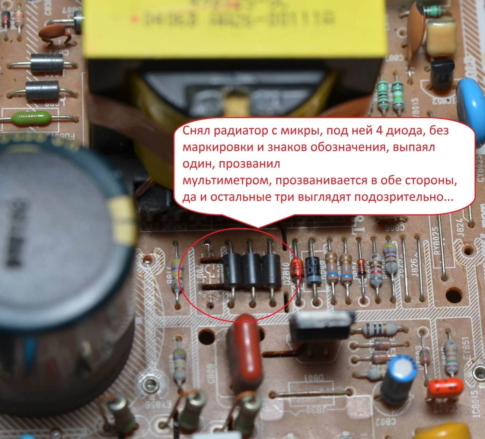 В ходе ремонта, высмотрел подозрительный диодный мост, под радиатором, какой-то микры, к тому-же на самом радиаторе, в левом нижнем углу, высмотрел, следы гари, выпаял один диод, он прозванивается в обе стороны, на самом диоде, никаких обозначений, может он какой-то "левый", а то что прозванивается в обе сторны, так и надо?