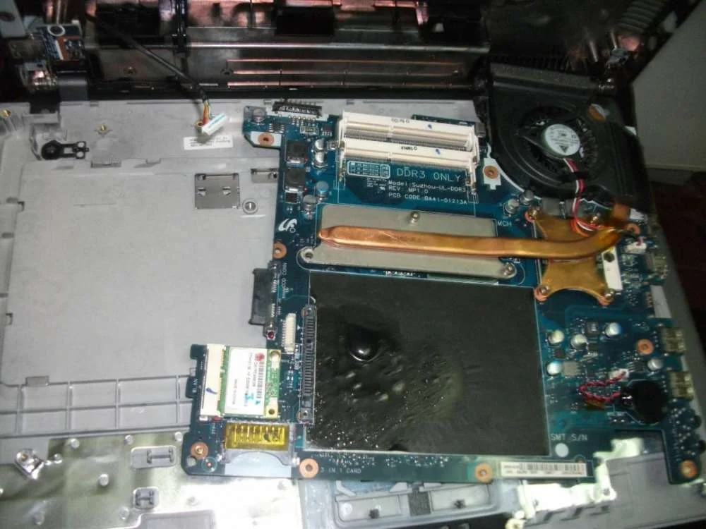 попала вода, окисление на плате. скорее всего, там уже зелень изумрудная .. надо было сразу снимать батарею, разбирать и сушить в разобранном виде