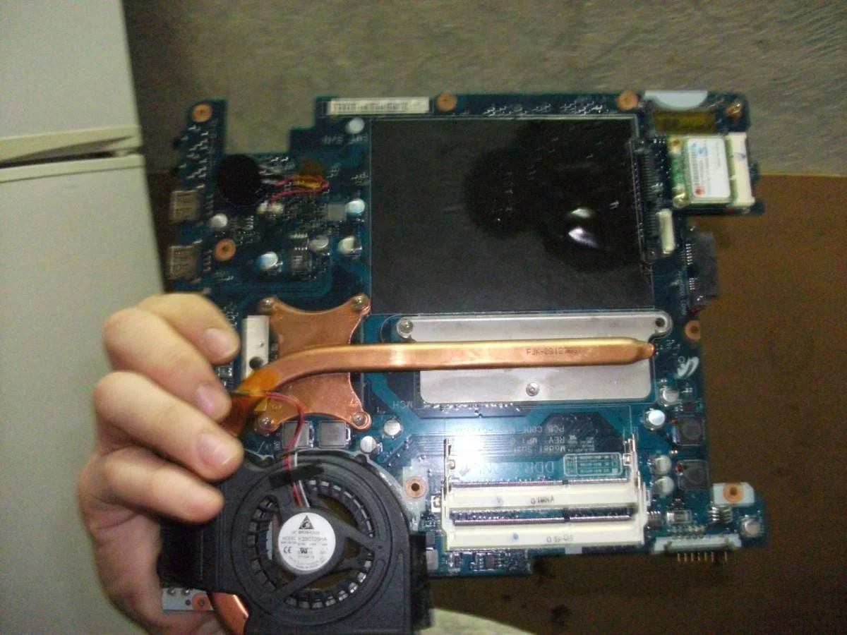 Ой ребят я ошибся. с процом всё норм. я ноут разобрал снова.действовал по методу всё вырубаем. и мамка заработала.без ничего без оперы,диска,клавы,мышки,и моника)но она иногда коротит штоль.охлаждение останавливается. Подскажите ребят что может быть??????????