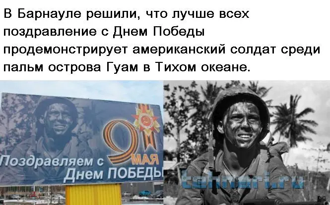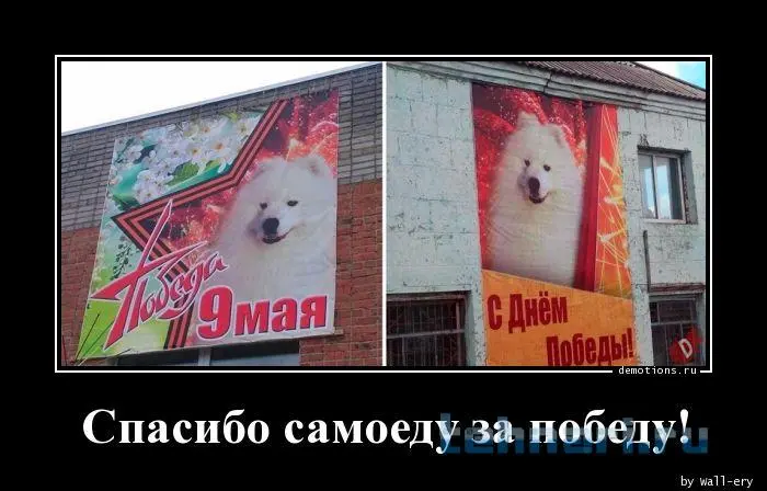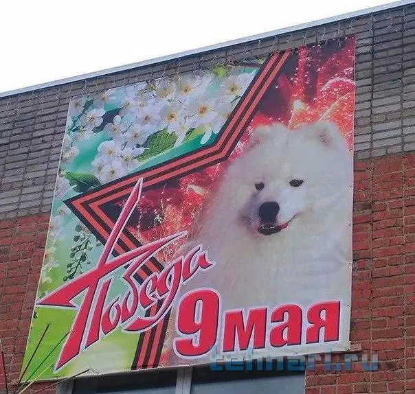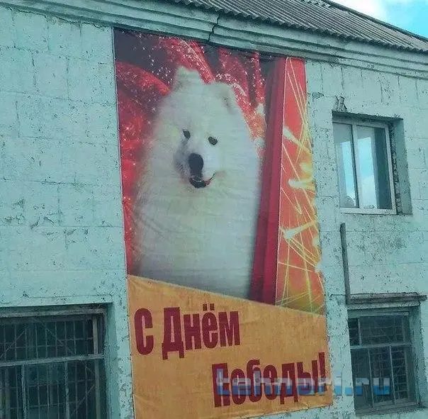 А фермер из поселка Тисуль в Кемеровской области развесил на фасадах принадлежащих ему зданий плакаты ко Дню Победы с портретом своей собаки, сообщается в паблике «Новокузнецк ОНЛАЙН» во «ВКонтакте».