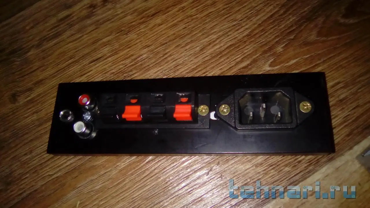 На задней панели находится двойной разъём под колонки, двойной RCA разъём, также разъём под джек 3.5 мм, ну и разъём сетевого питания. Опять же, все сигнальные цепи расположены как можно дальше от высоковольтных цепей.