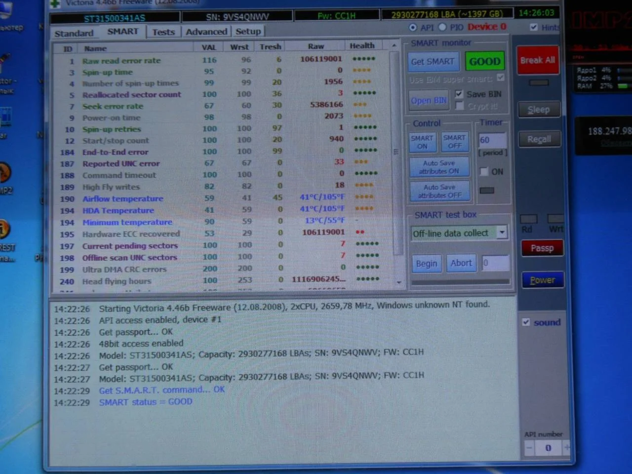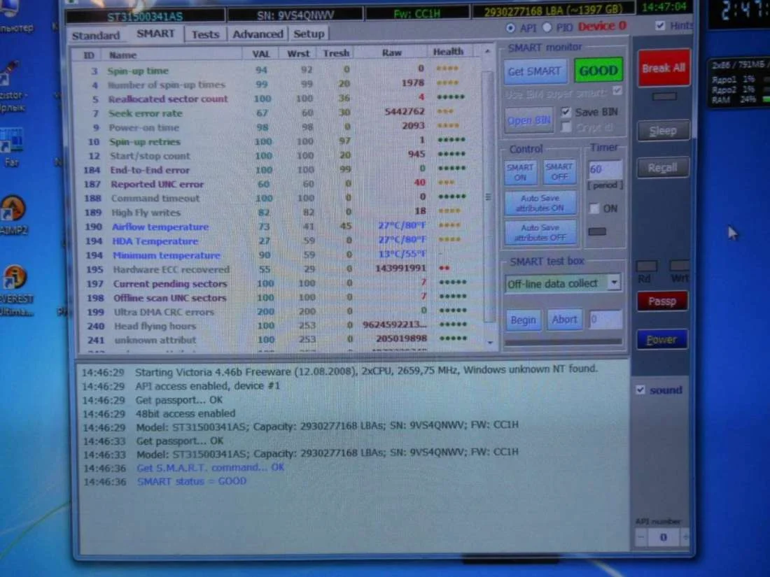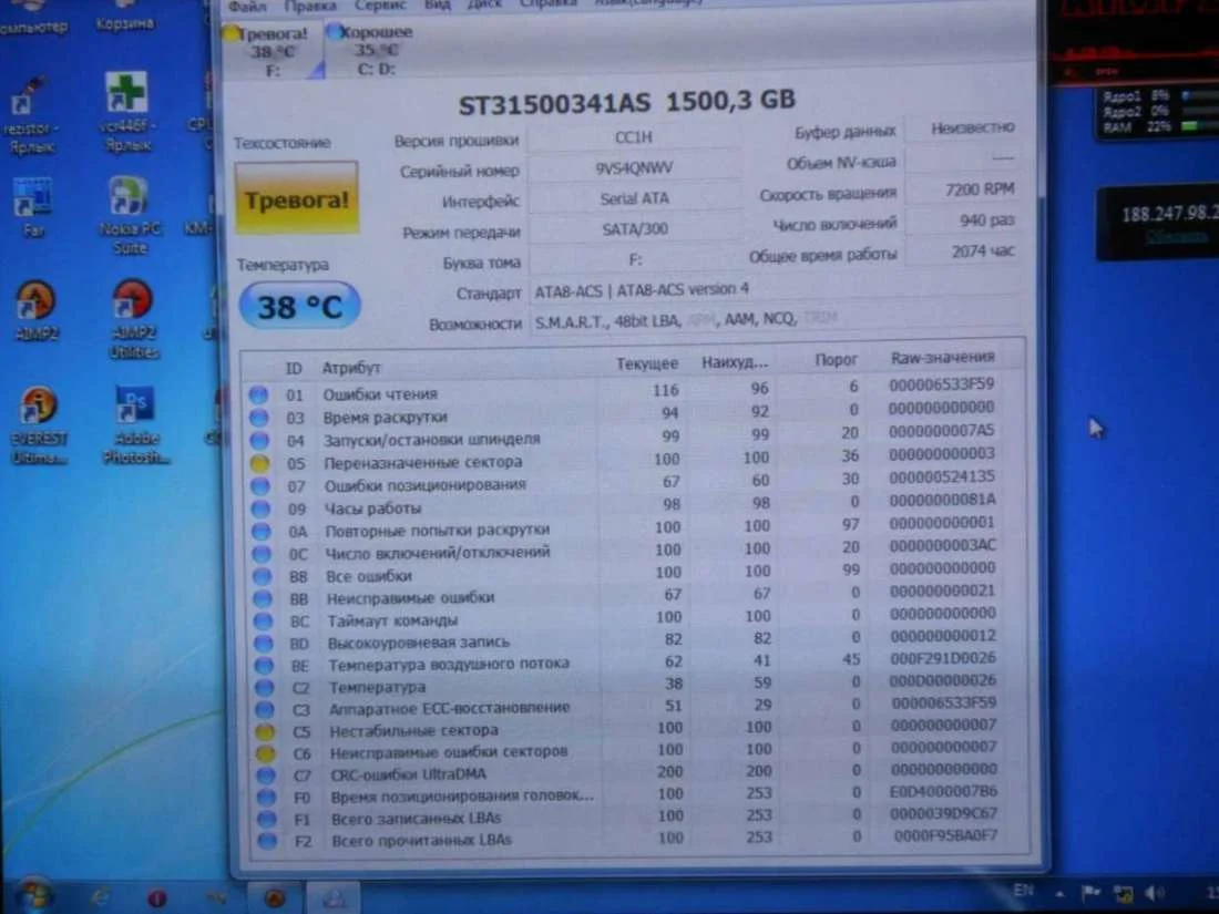 Всем привет!У меня проблема с HDD Seagate на 1500Gb,прожил он у меня примерно год и начал выделываться,был в роли большой флэшки для хранения фильмов.Windows 7 находиться на другом диске,вобщем в один прекрасный день он начал очень сильно зависать при открытии фильма,то не хотел копировать файлы ни к сибе ни от себя,то не мог раскрутиться при включении пк.,а то и вовсе зависала вся система из-за него,мне все это надоело и я снес с него всю колекцию фильмов и снял его на полочку на которой он долго пролежал.Теперь я про него всполнил и поставил в пк просканировал поверхность викторией,но на первой минуте он завис прямо в ней и нашол сектор с временем отклика 600,остальные попытки просканировать были безуспешными он постояно зависал,отключил его от системы и заново подключил,запустил викторию+REMAP,просканировал нормально секторов с большим временем вроде нет но смарт меня насторожил,рисует 3 переназначенных сектора,7 нестабильных и 7 с неисправными ошибками!!!Фото Виктории в режиме смарт прилагаю и фото проги Кристал диск инфо.Вобщем суть вопроса такова:диску пора на свалку или можно попробывать сделать его???