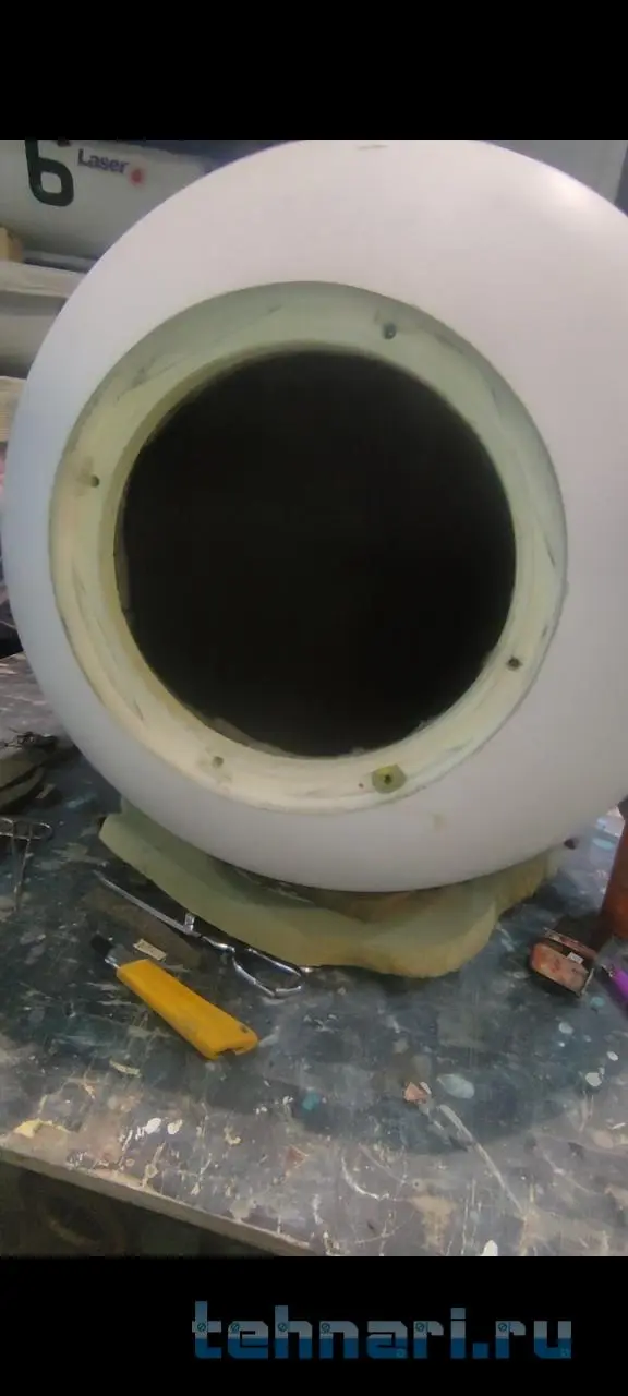 Здравствуйте.Закончил свой проект акустики в виде шара и хочу поделиться результатами.Краткие характеристики : Внешний диаметр 76см , внутренний 70см.Обьëм180л. Вес без динамика 9кг. Стеклопластик , сендвич.Динамик , 12 дюймов yamaha JA3058A (резонанс 14гц). Рабочий диапазон колонки 24гц-500гц. Работает от своего усилителя , отрезанного первым порядком от 60гц и выше. Основная задача была получить РЕАЛЬНЫЙ диапазон до 20гц. не дотянул 4гц. Сильно не печалюсь т.к. редкий музыкальный инструмент играет до 25гц. Проделанной работой доволен, наконец-то в моём доме появился полноценный бас.В планах шар 500л, с 15 или 18 дюймовым динамиком и добраться до 20гц. С удовольствием отвечу на вопросы если таковые возникнут.