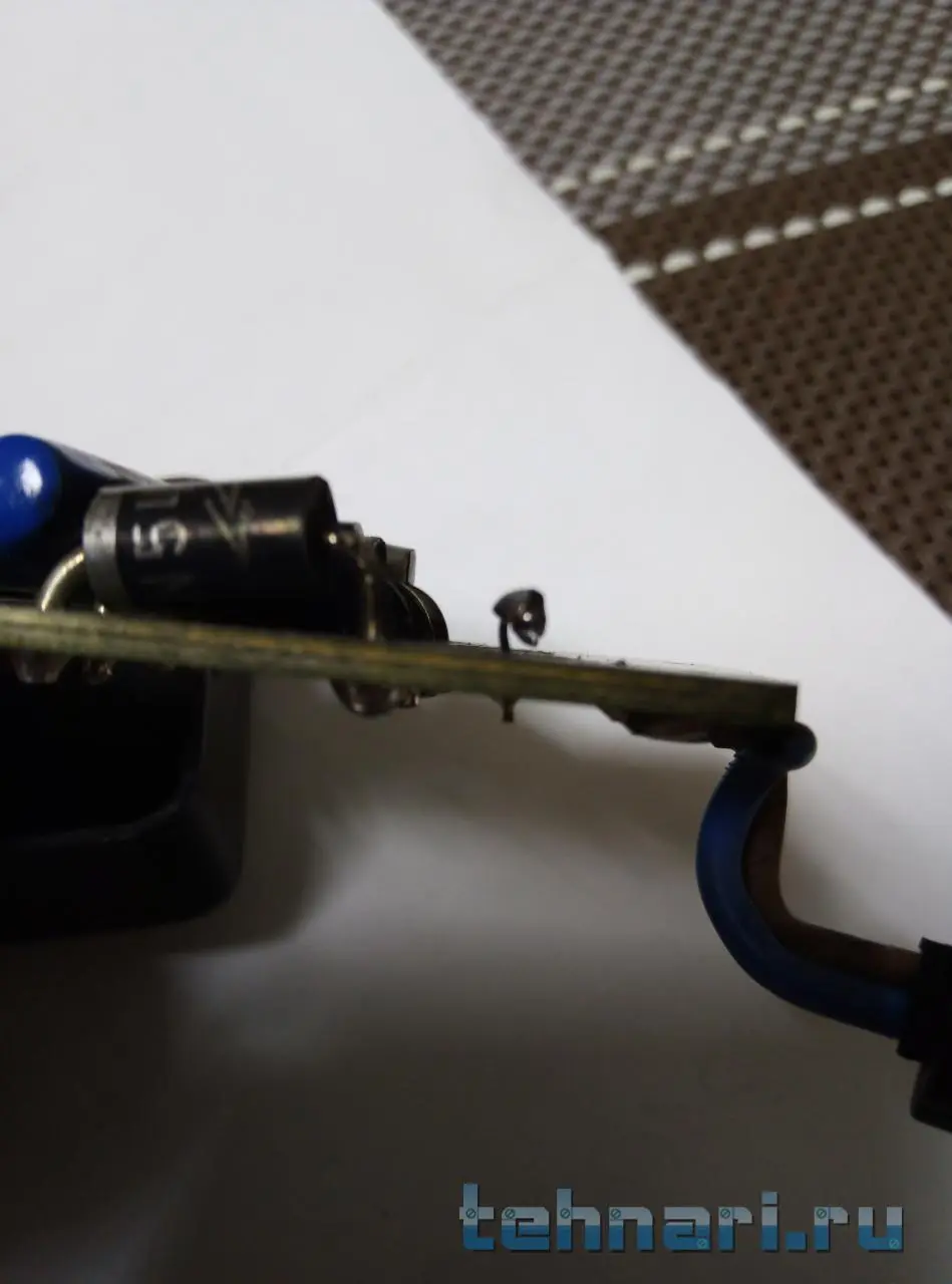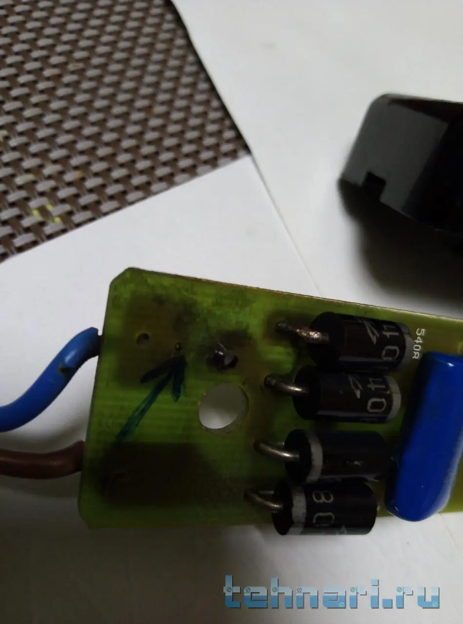 Здравствуйте, подскажите кто может, что за элемент сгорел? Осталась одна ножка. Фото прилагаю.