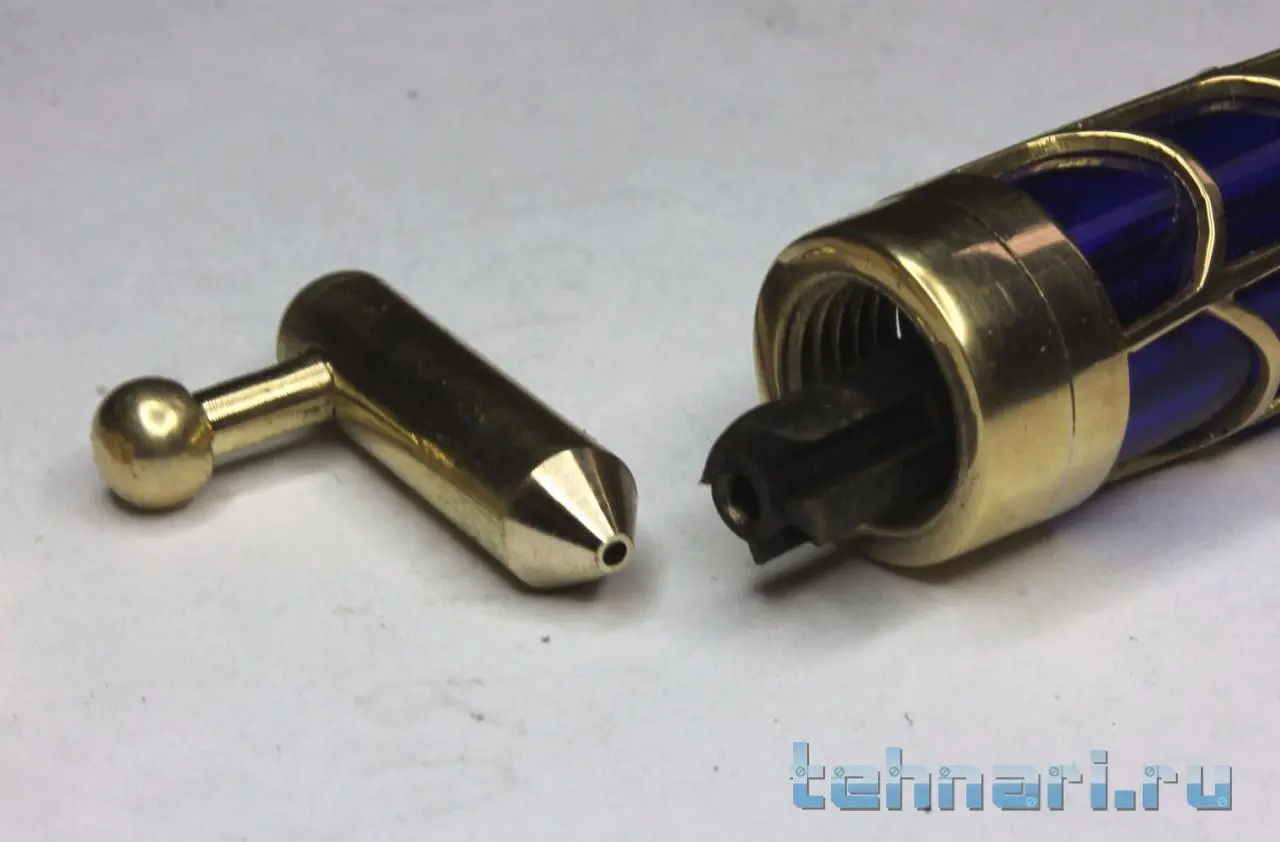 шток, который надавливает на пишущий стержень, имеет конус, который входит в отверстие стержня.