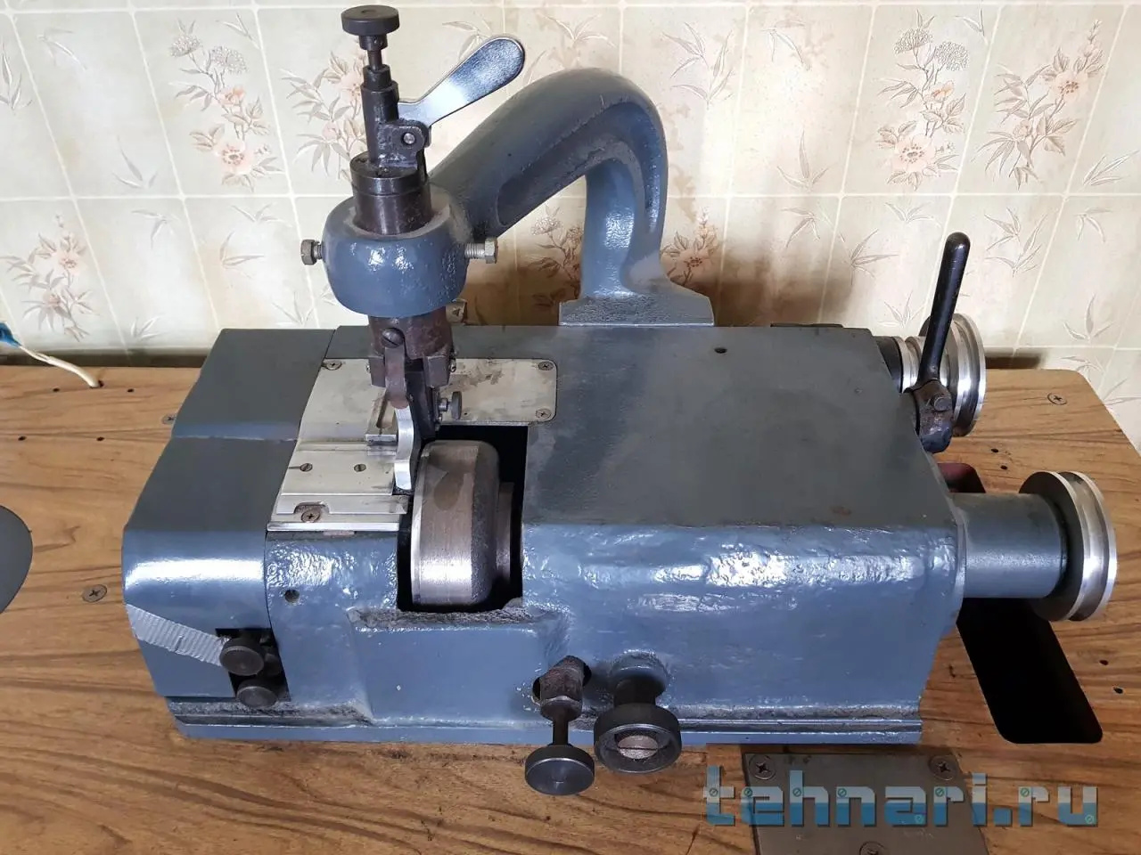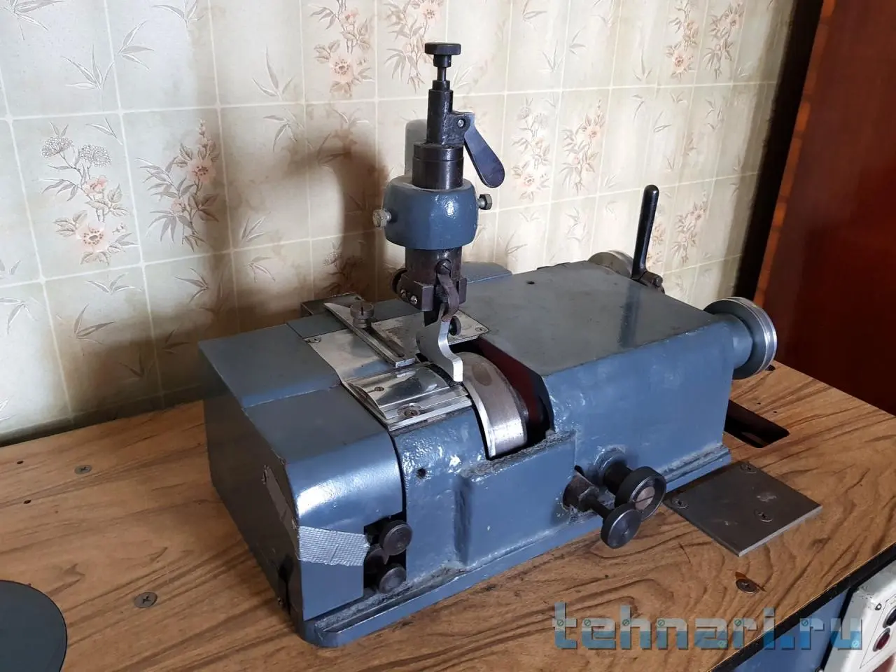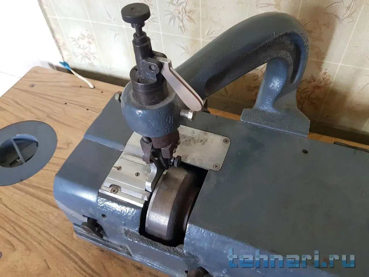 Машина представляет из себя платформу с ножом в виде чашки, подающий абразивный ролик и прижимающую лапку, это если вкратце.