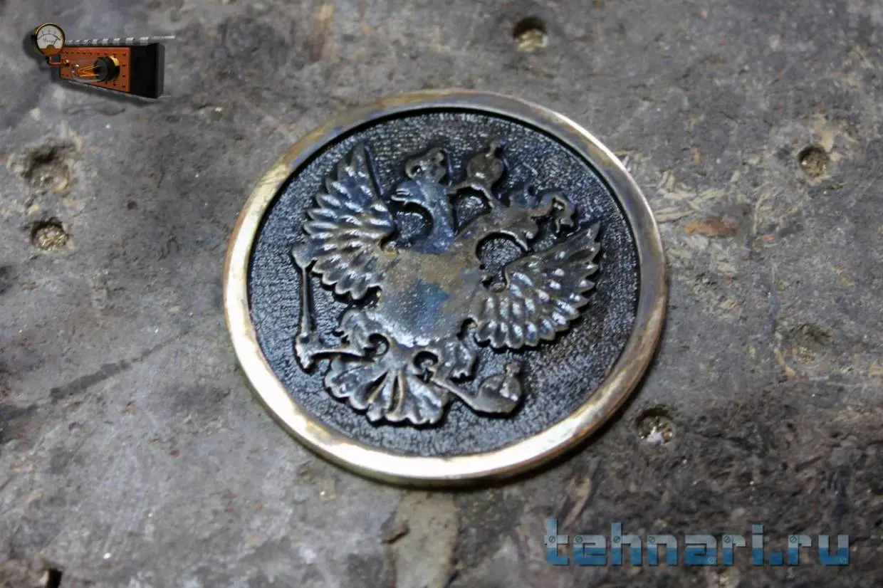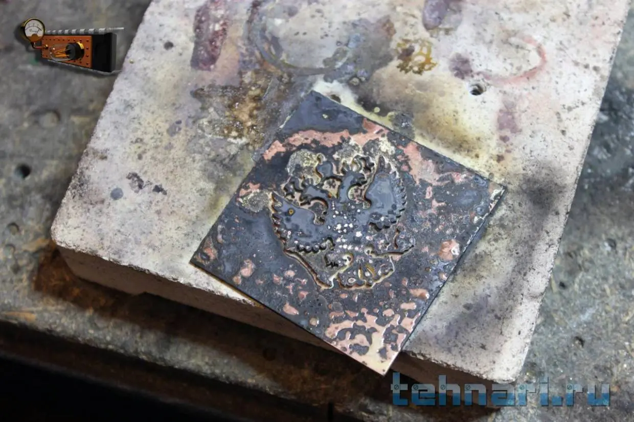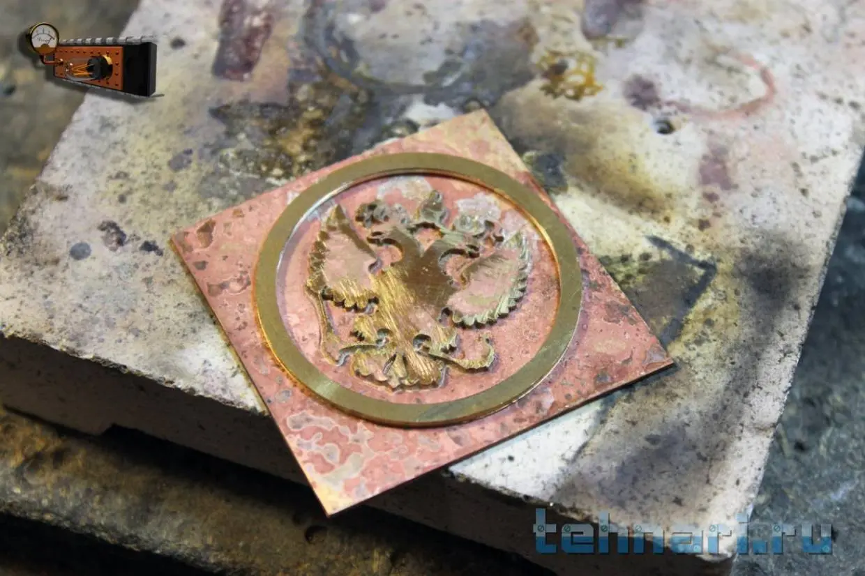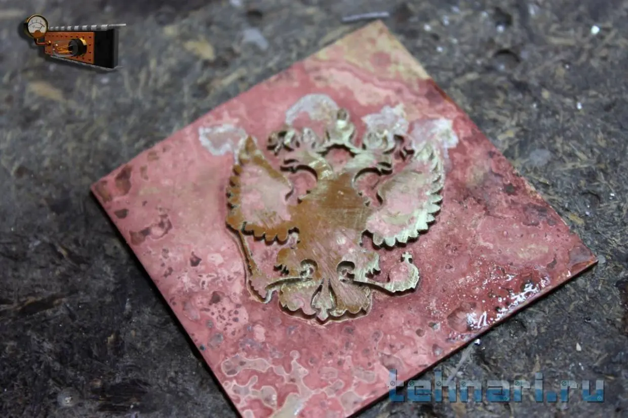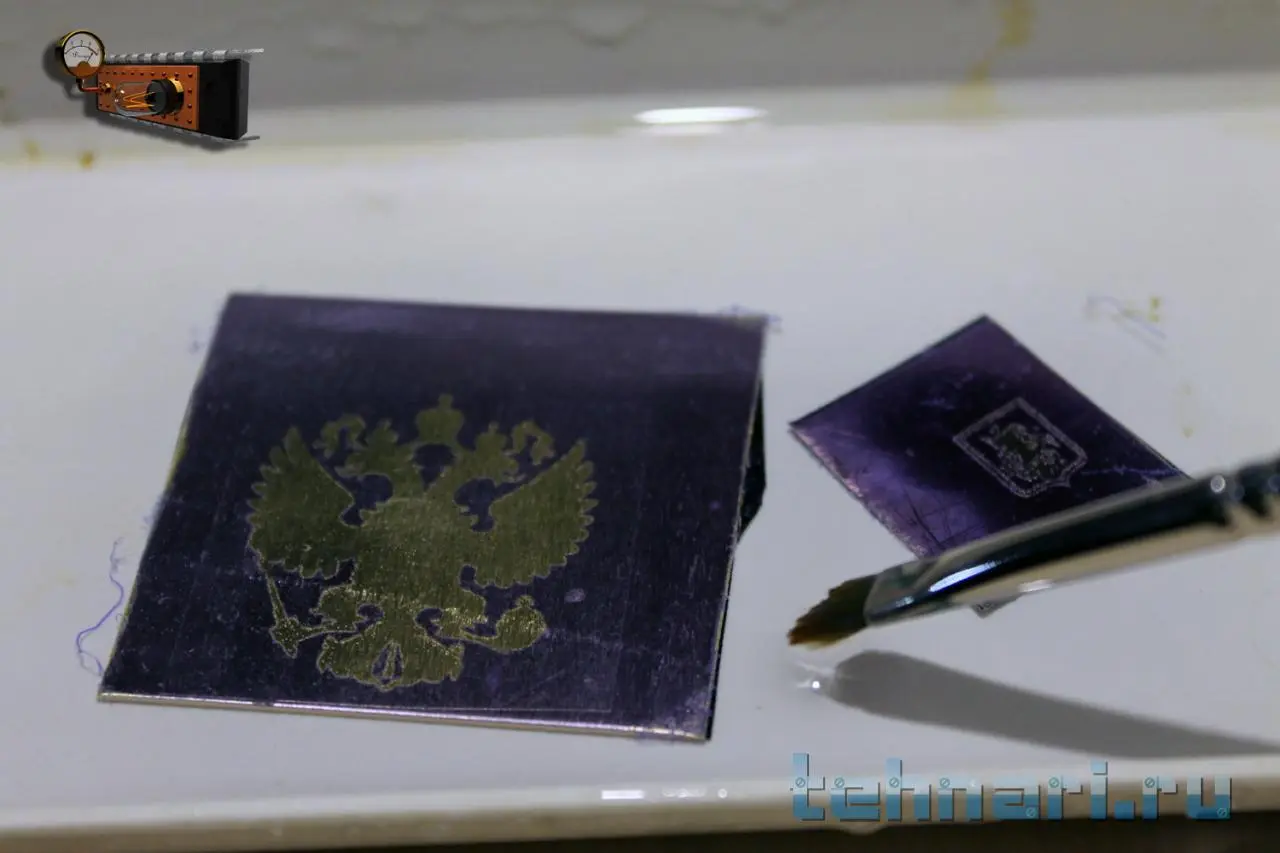 Первым делом с помощью фоторезиста наношу контур двуглавого орла на латунную пластину. Одновременно на кусочек полированной бронзы наношу изображение Георгия Победоносца.