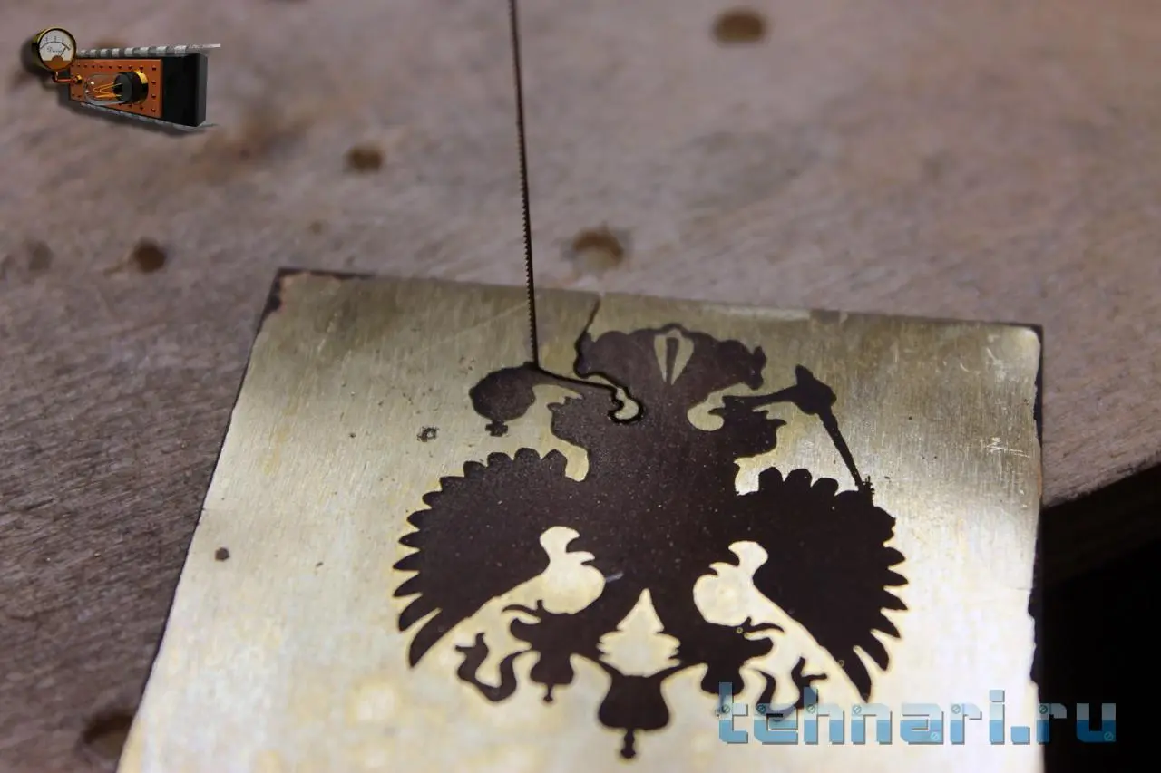 Потом протравливаю в хлорном железе и получаю чёткий контур, для большей контрастности обработал селенистой кислотой. Теперь выпиливаю ювелирным лобзиком.