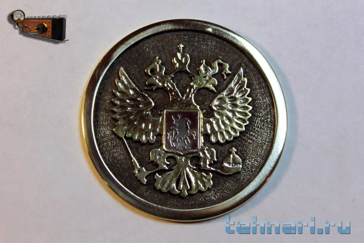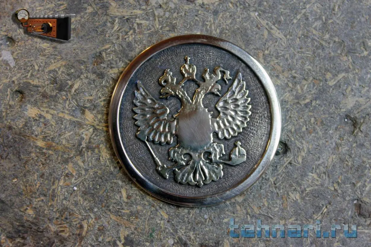 Понадобился мне шильдик с гербом России, поискал в магазинах и не нашёл ничего подходящего. Пришлось делать самому.