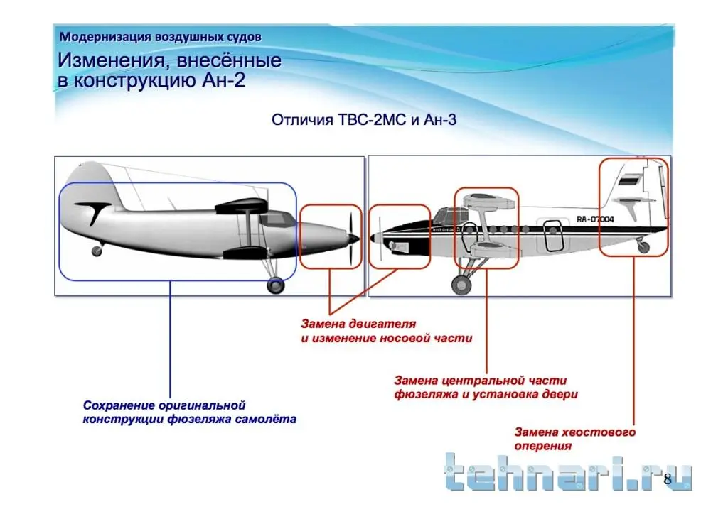 Как это можно сделать, знают специалисты СибНИА имени С. А. Чаплыгина. В 2013 году они показали на Международном авиакосмическом салоне ремоторизированный Ан-2. Не секрет, что в наших реалиях использование самолётов с поршневыми двигателями — удовольствие не из дешёвых: в стране отсутствует отечественный авиационный бензин. Самолёт, в котором родной мотор «аннушки» был заменён на турбовинтовой американский двигатель фирмы Honeywell, такой проблемы лишён: керосин в несколько раз дешевле авиационного бензина. С заменой мотора улучшаются и другие характеристики: уменьшается расход топлива, снижается стоимость лётного часа, увеличивается межремонтный ресурс двигателя, возрастает дальность полёта и крейсерская скорость машины.