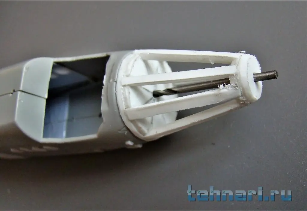 После просушки шпаклевки произвел ее зачистку шкуркой и наклеил на носовой конус каркас воздухозаборника маслорадиатора.