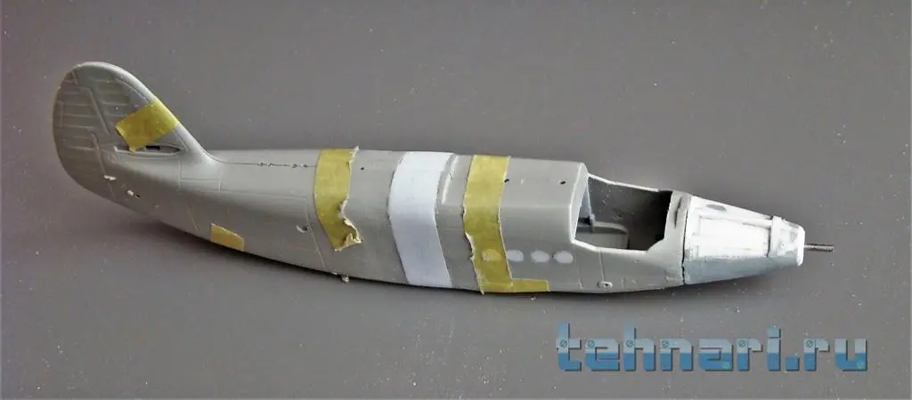 Пока остов носового кока сохнет, займусь увеличением длины фюзеляжа. Намечено место реза, выделено малярной лентой и при помощи микропилки произведено разделение корпуса на две половинки.