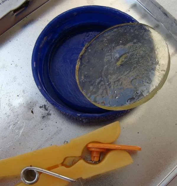 Я замесил эту эпоксидку в крышке от 5л бутылки... Этот "блин" - он не полностью засох, но относительно так подсох(Сам он прочный-фиг разломишь)...