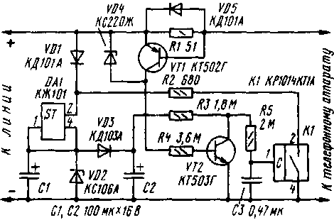 Эта простая, но в то же время очень эффективная схема блокиратора. выполняет функцию электронного замка, и не позволит воспользоваться вашей телефонной линией , в ваше отсутствие, что избавит вас от оплаты чужих телефонных разговоров. Блокиратор включается в разрыв телефонной линии. Лучше это сделать там, где тел. провод входит в вашу квартиру. Блокиратор не требует отдельного питания ( как это видно на схеме ) и не занимает много места.