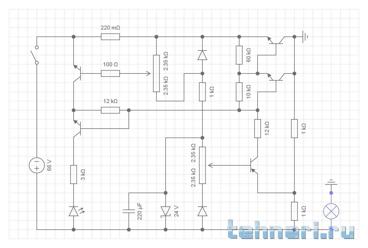 Специально для лентяев выкладываю схему, адаптированную под входное напряжение 66 В: