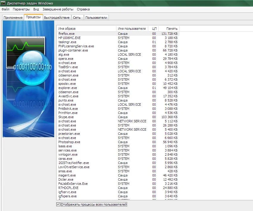 поставить галочку-отображать процессы всех пользователей.... и выложить все процессы сюда сделав несколько снимков