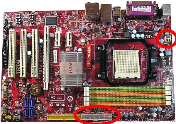 1) Для того, чтобы плата "завелась", необходимо подключить ДВА разъёма (а на "хвостах" многих блоков питания большой разъём состоит из двух частей, маленькой с четырьмя и большой с двадцатью контактами. В таком случае, к материнской плате надо подключить три разъёма блока питания). Я обвёл красным: