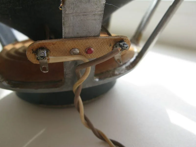 Вот подготовил первый динамик. не подскажите где "+" на динамика,чисто интуитивно предполагаю, что со стороны красной точки