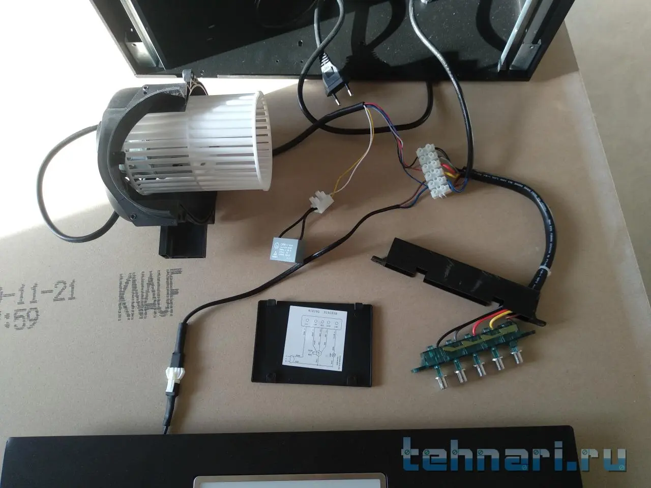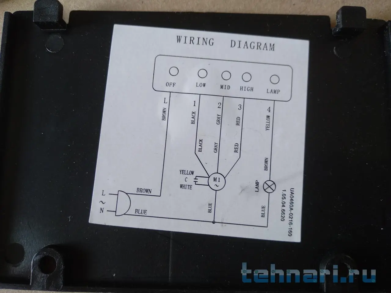 Вот, разобрал все потроха. Вообще всё примитивно. Шнур питания на колодку приходит, коричневый питающий провод уходит на блок кнопок. С кнопок 3 провода уодят на двигатель и 1 провод на подсветку. Синий провод с кабеля питания разходится напрямую на двигатель и на подсветку. К двигателю ещё кондёр подключён. Ну и схемка ещё есть.