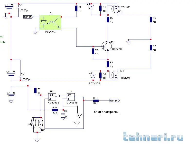D1 D2- стабилитроны на 15в, т.к. мах допустимое напряжение на затворе 20в. При нормальной работе триггер выдает лог 1 (выход OP_IN), за счет оптрона подается ток на Q2 и за счет открытого транзистора обеспечивается по 15в на затворах, олевики открыты. После полевиков ставит конденсаторы не надо, их сопротивлении мало (напрмер, IRF2804 2 миллиом), Р канальные обычно больше, можно найти 10 миллиом, при мощности 100ватт (потребляемая 200) ток не будет превышать 10А, или мощность 10*10*0.01 =1 ватт тока на ключе, т.е. радиатор на полевик при 10 миллиом и меньше не надо, или можно поставить самый маленький.