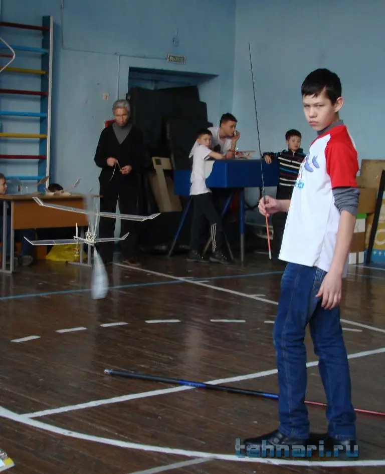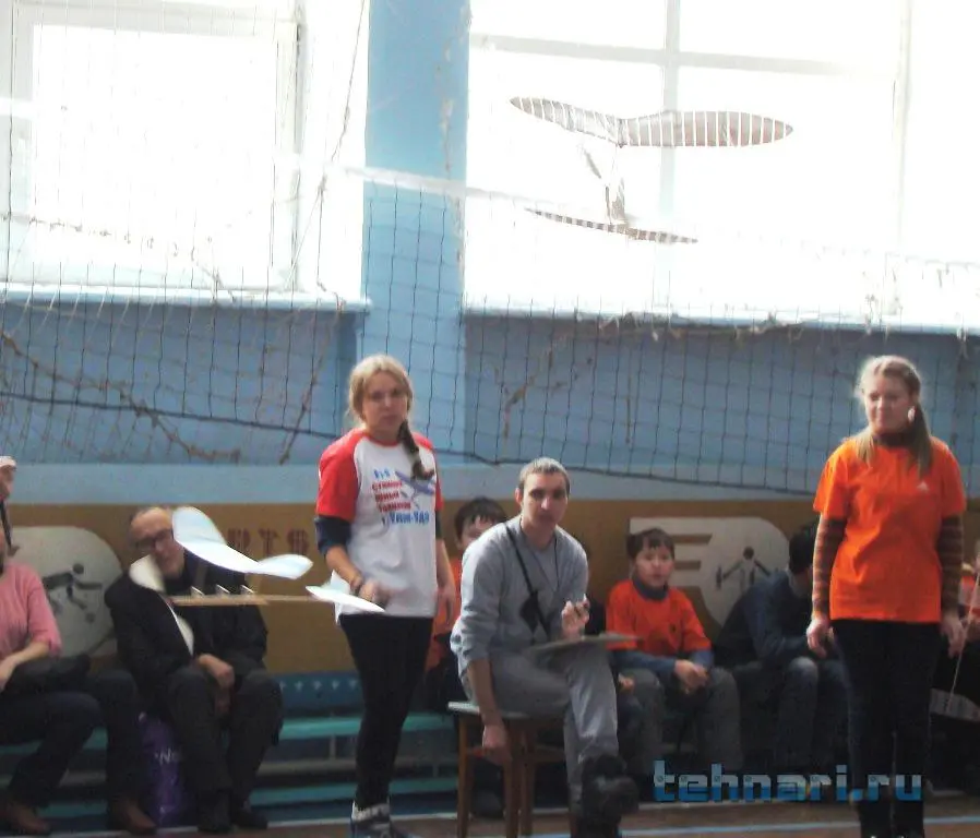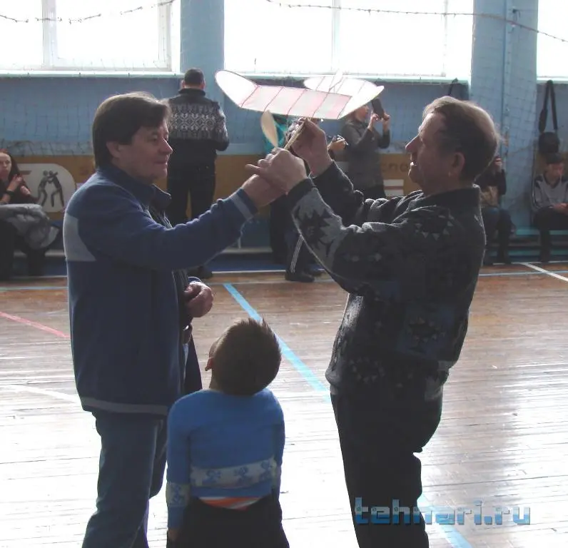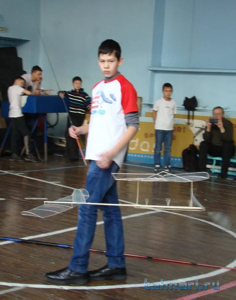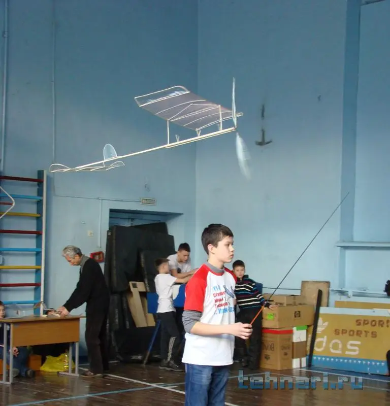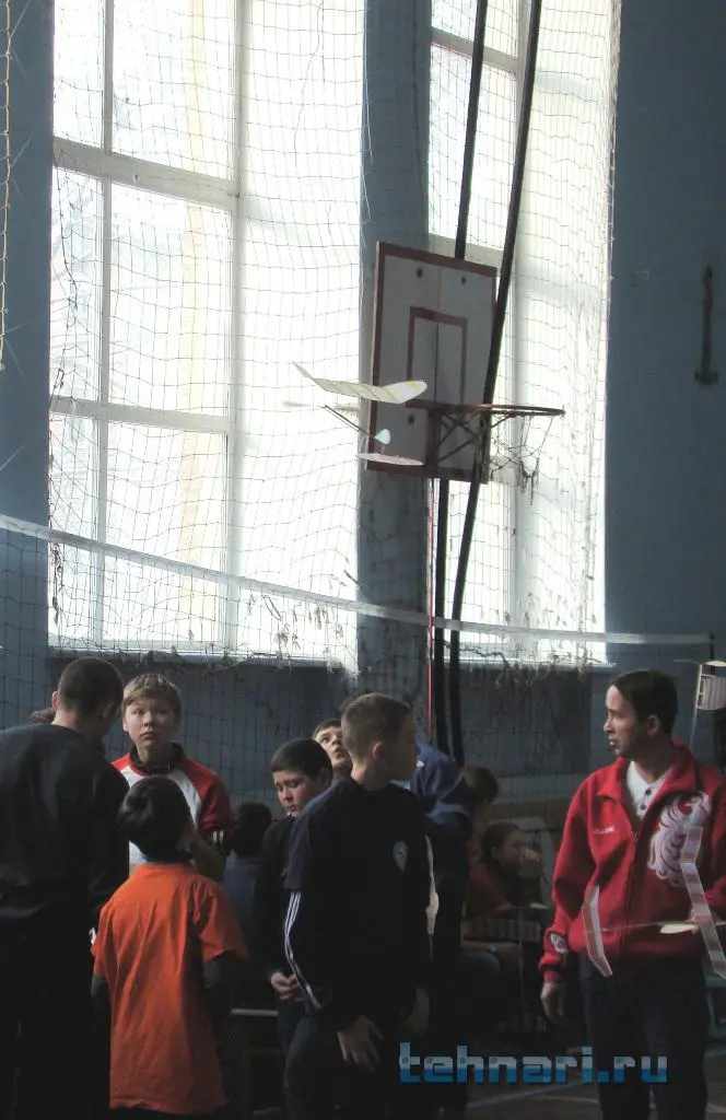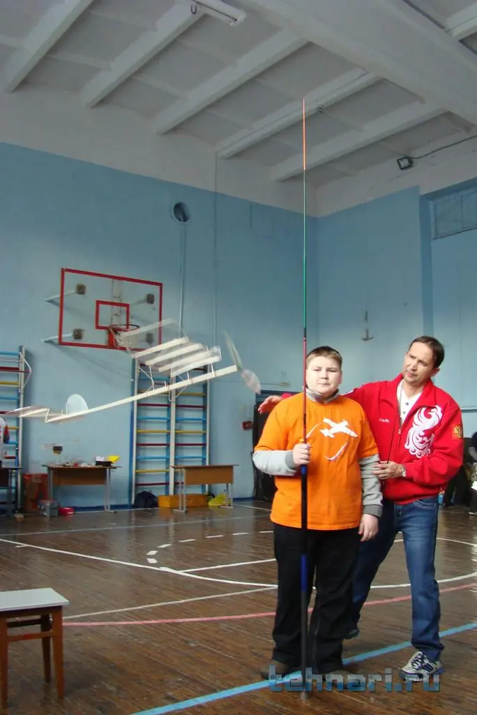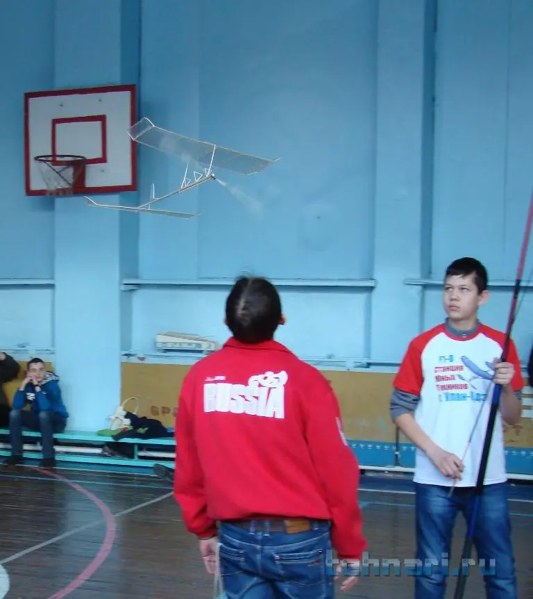 А вот и большие авиамодели с более мощными резиномоторами. Для их управления приходится применять удилища и стек, поскольку высоты и ширины спортзала им явно недостаточно.
