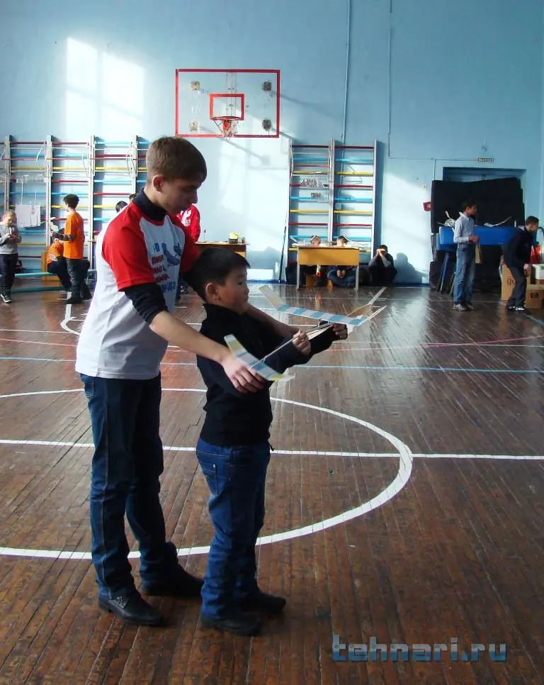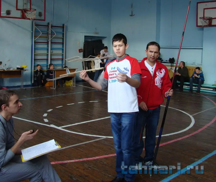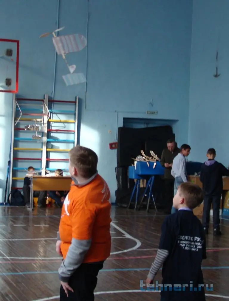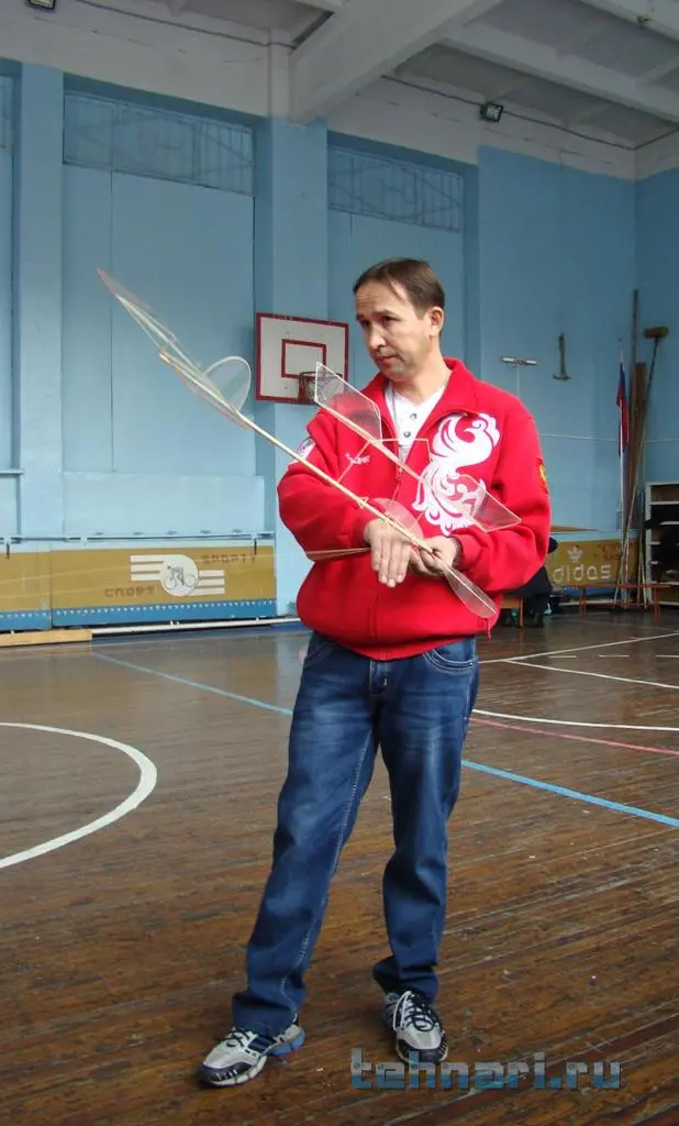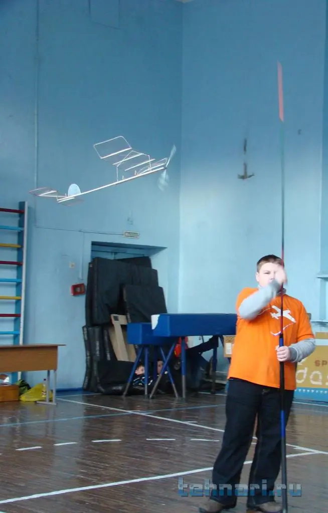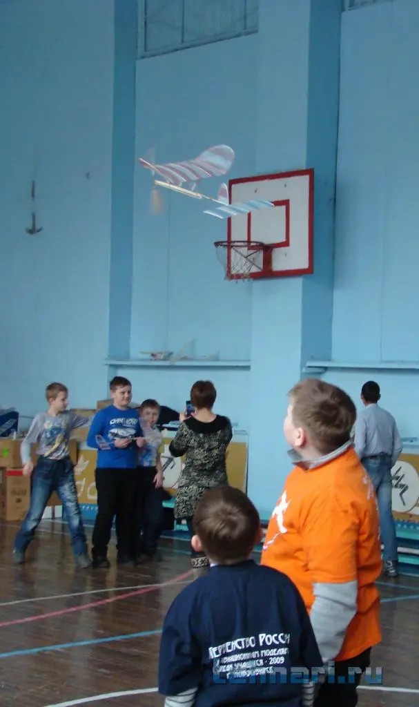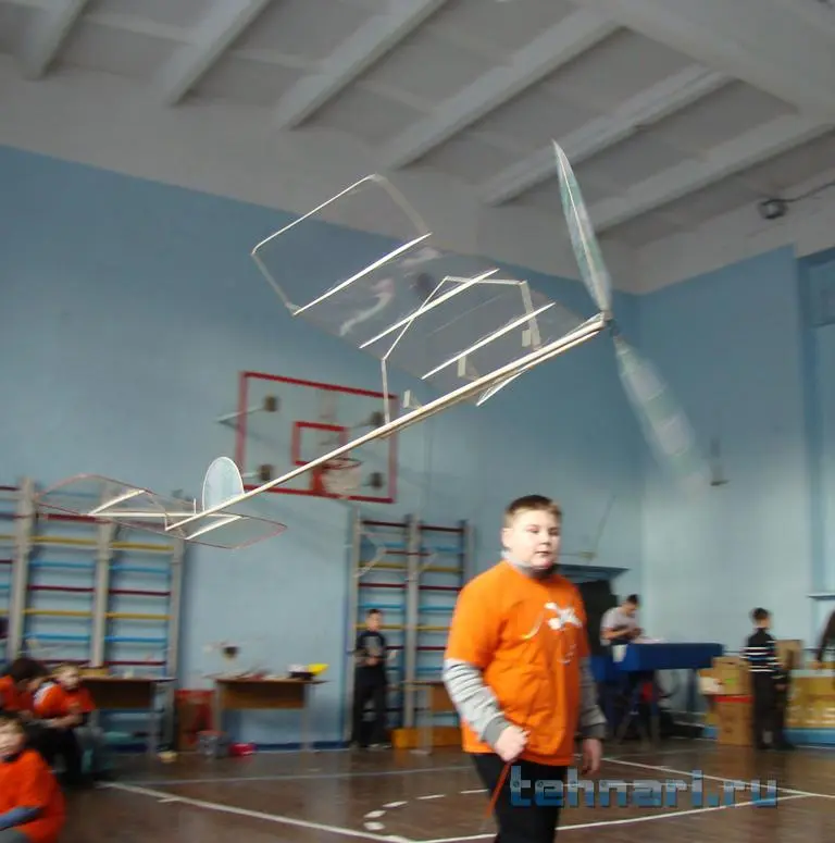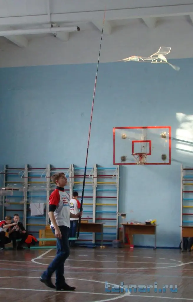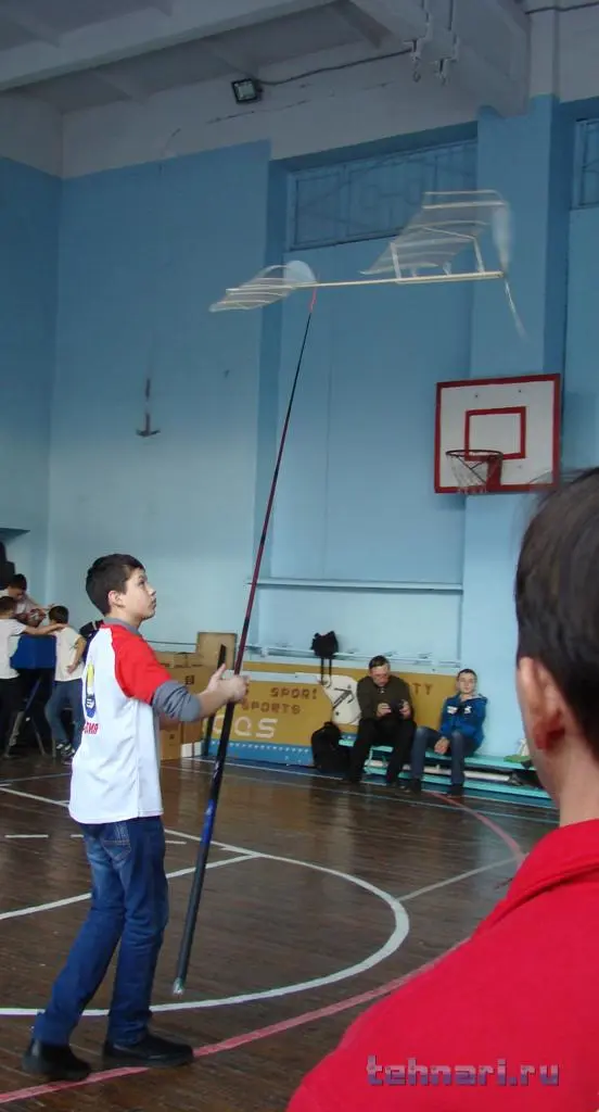 А вот и большие авиамодели с более мощными резиномоторами. Для их управления приходится применять удилища и стек, поскольку высоты и ширины спортзала им явно недостаточно.