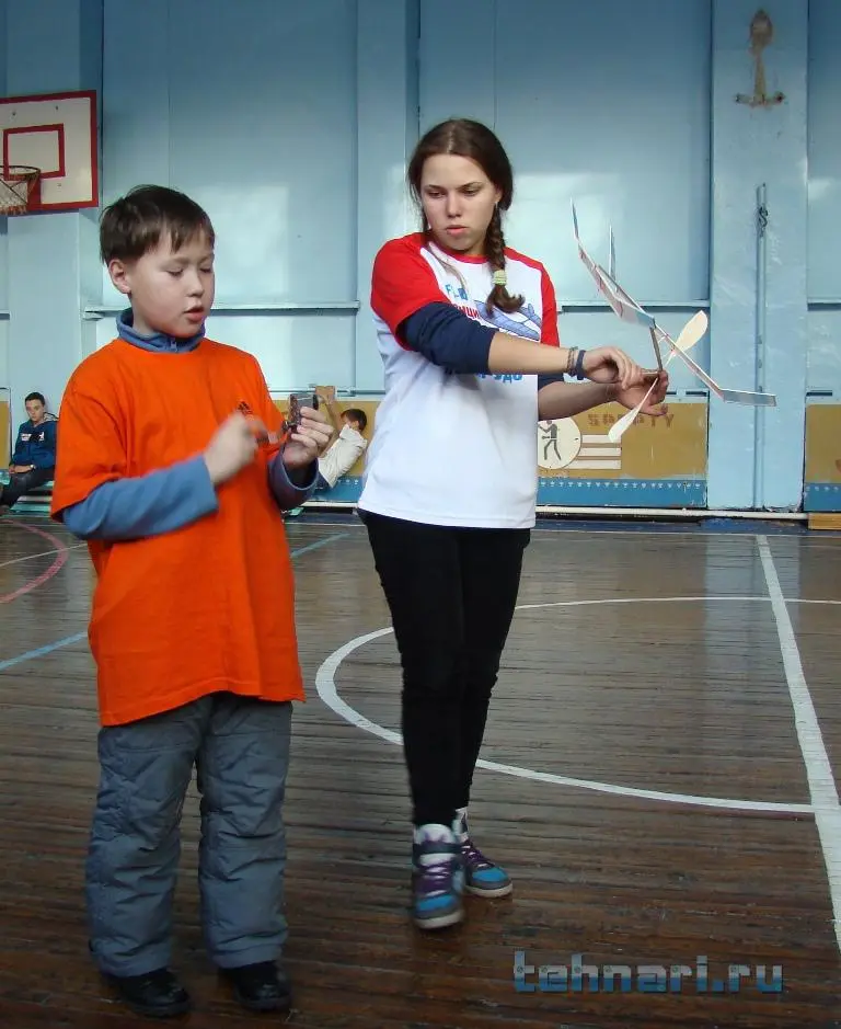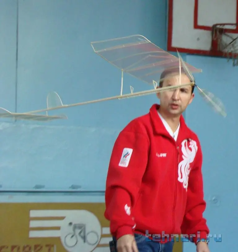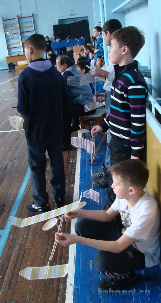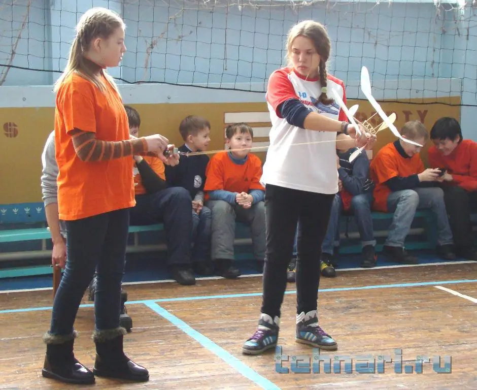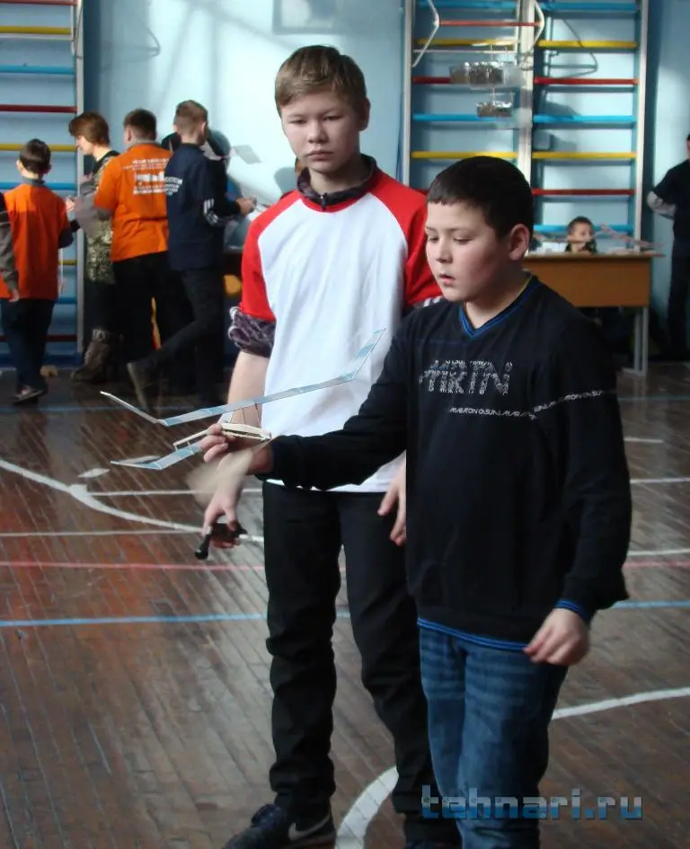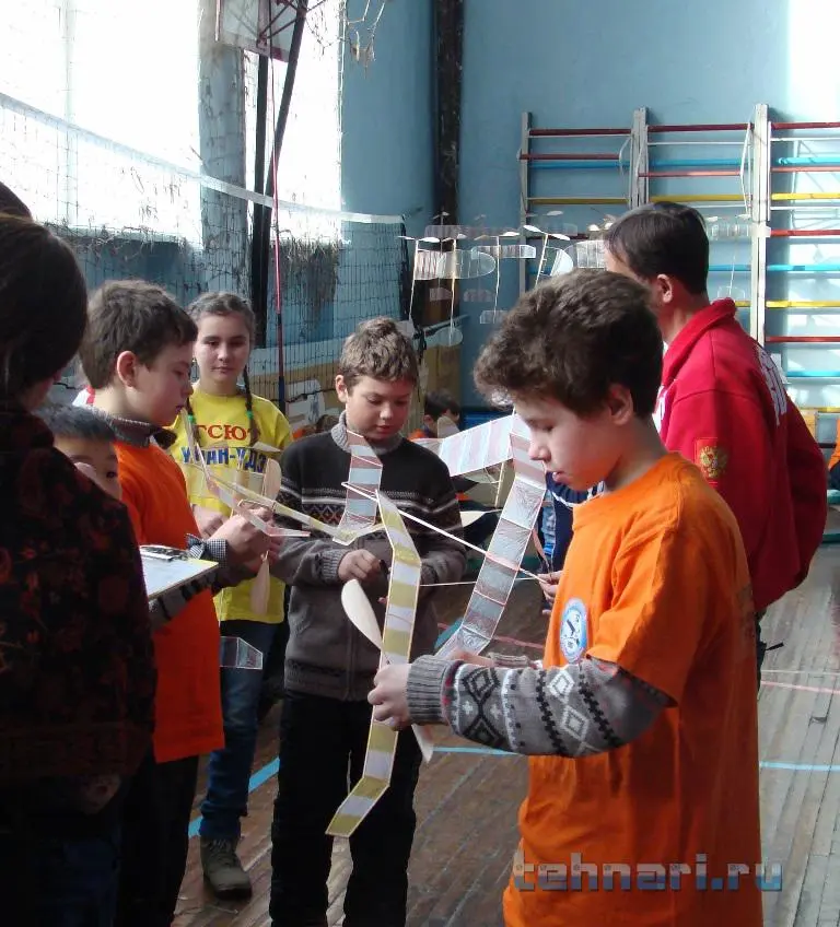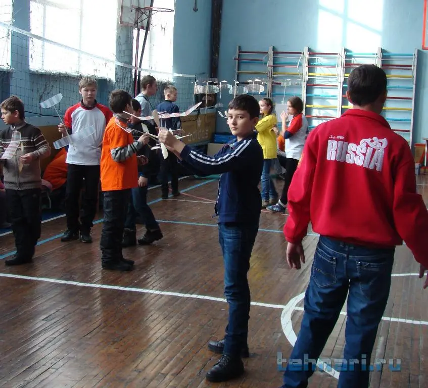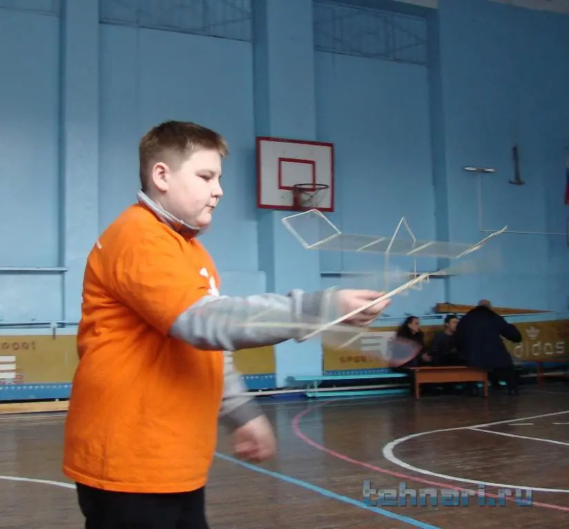 А вот и большие авиамодели с более мощными резиномоторами. Для их управления приходится применять удилища и стек, поскольку высоты и ширины спортзала им явно недостаточно.