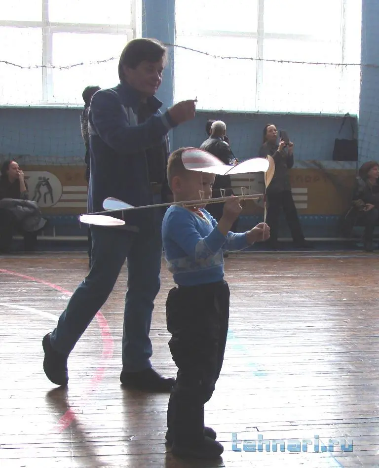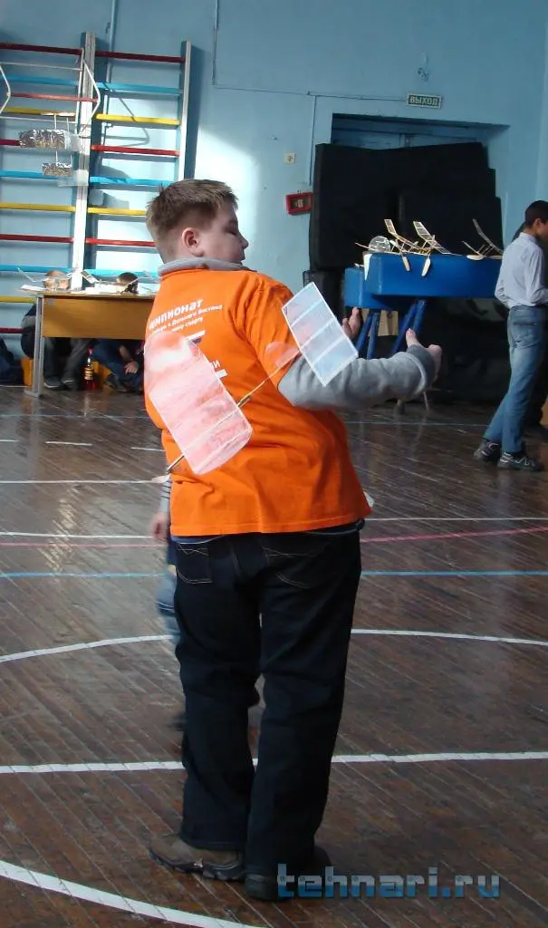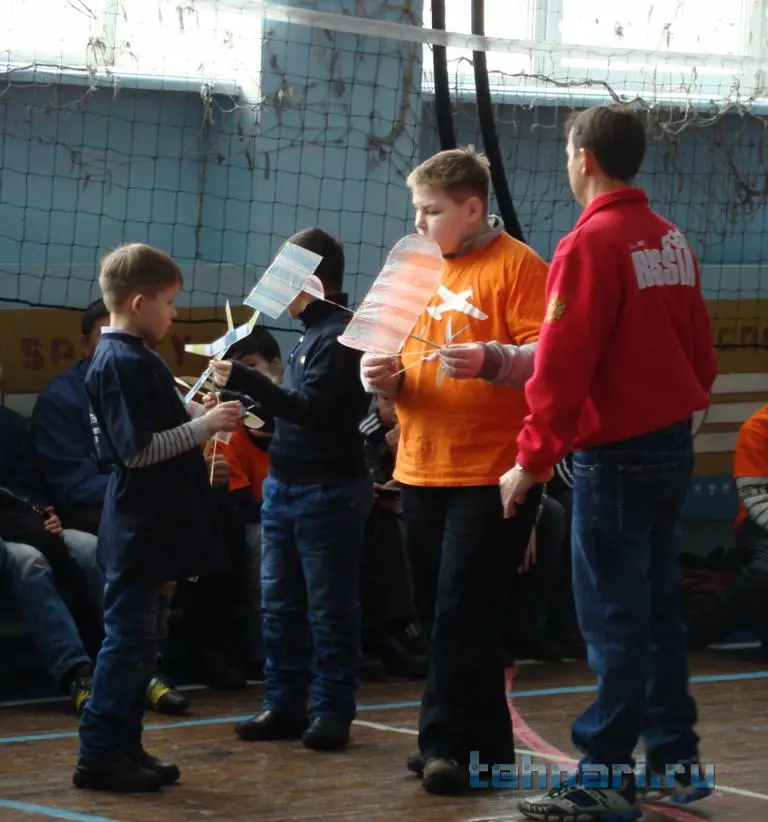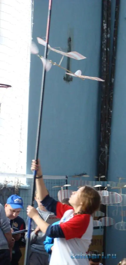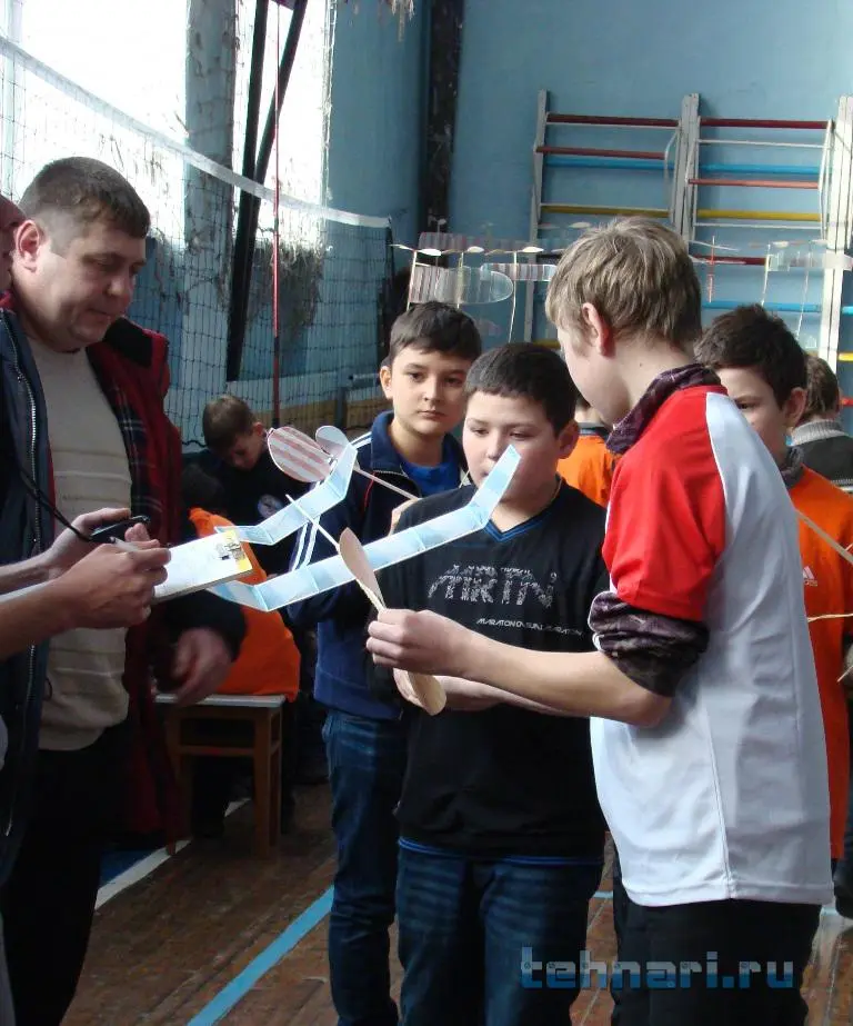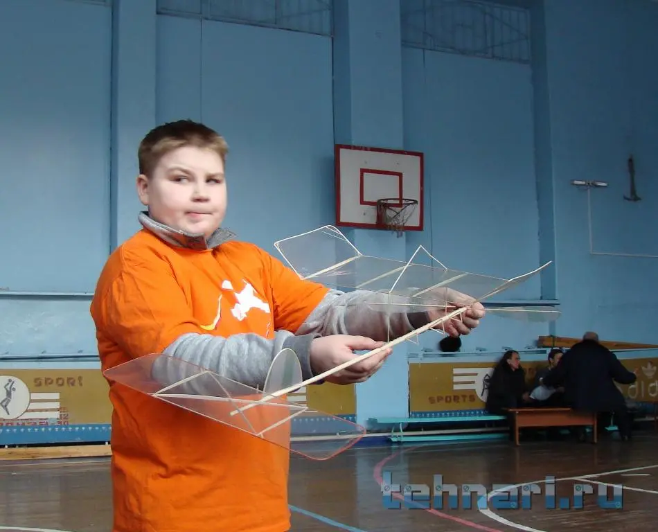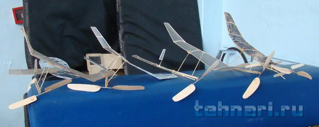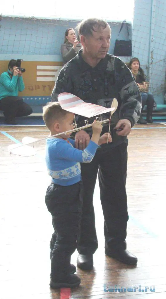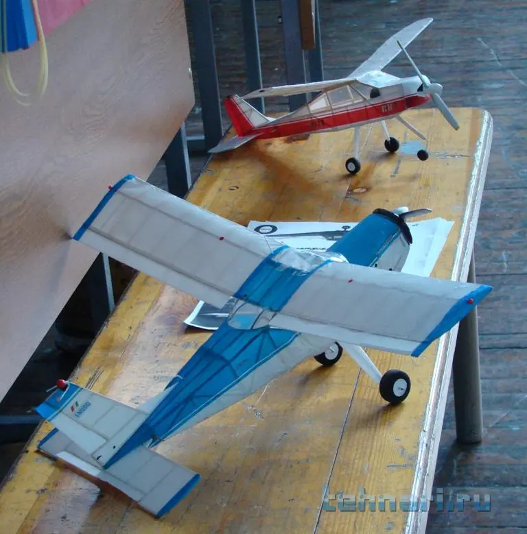 А вот и большие авиамодели с более мощными резиномоторами. Для их управления приходится применять удилища и стек, поскольку высоты и ширины спортзала им явно недостаточно.
