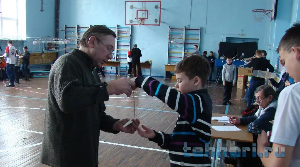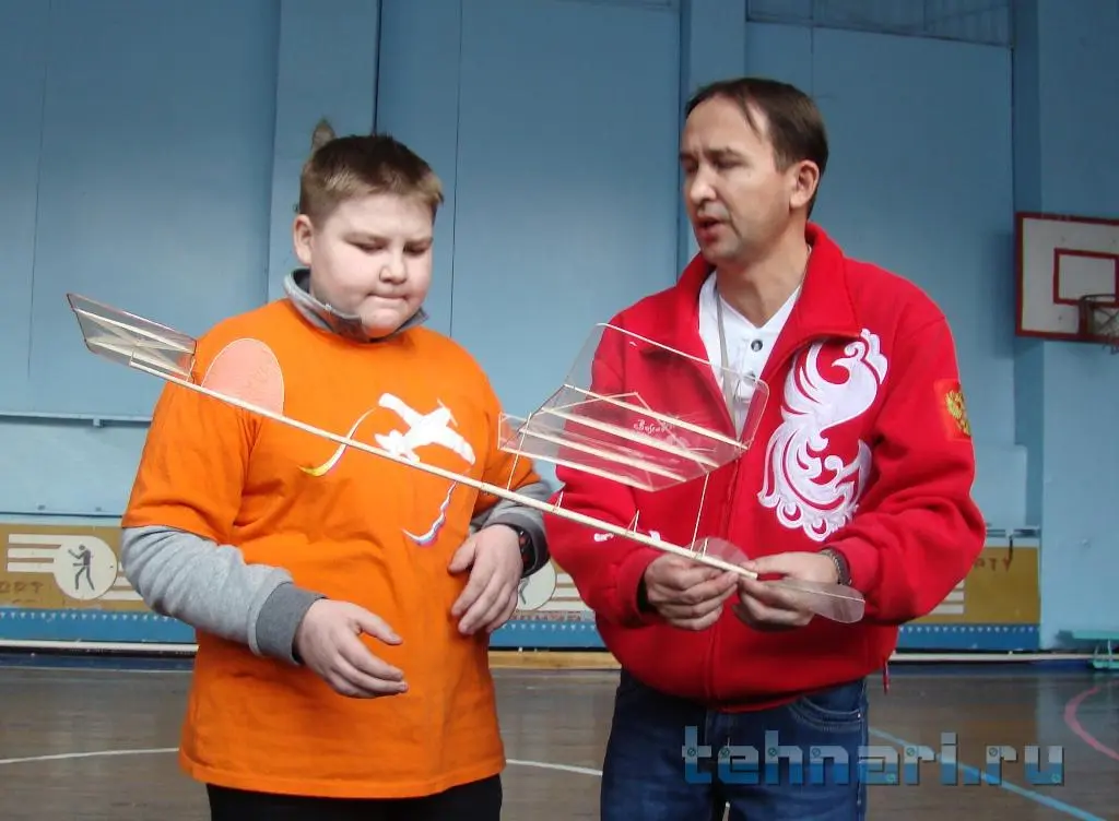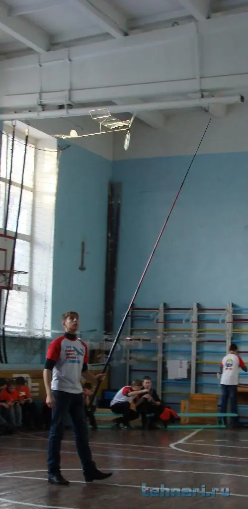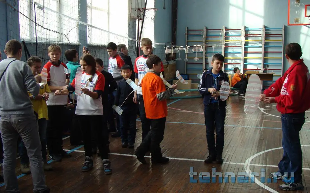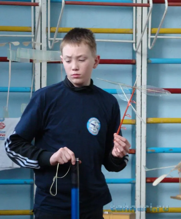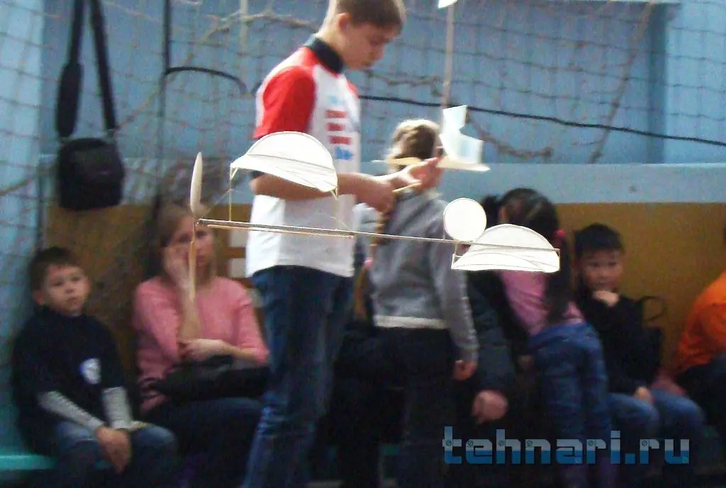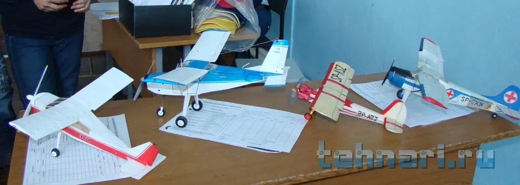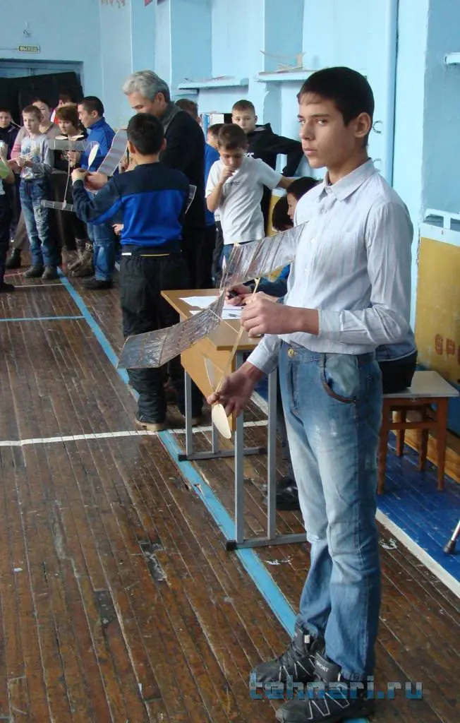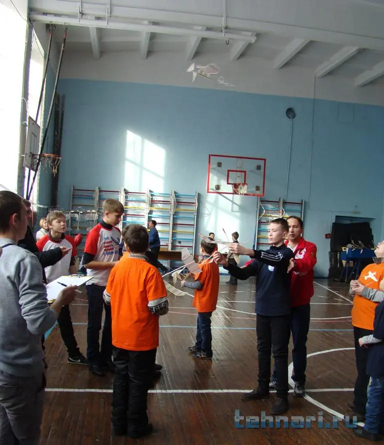 А вот и большие авиамодели с более мощными резиномоторами. Для их управления приходится применять удилища и стек, поскольку высоты и ширины спортзала им явно недостаточно.