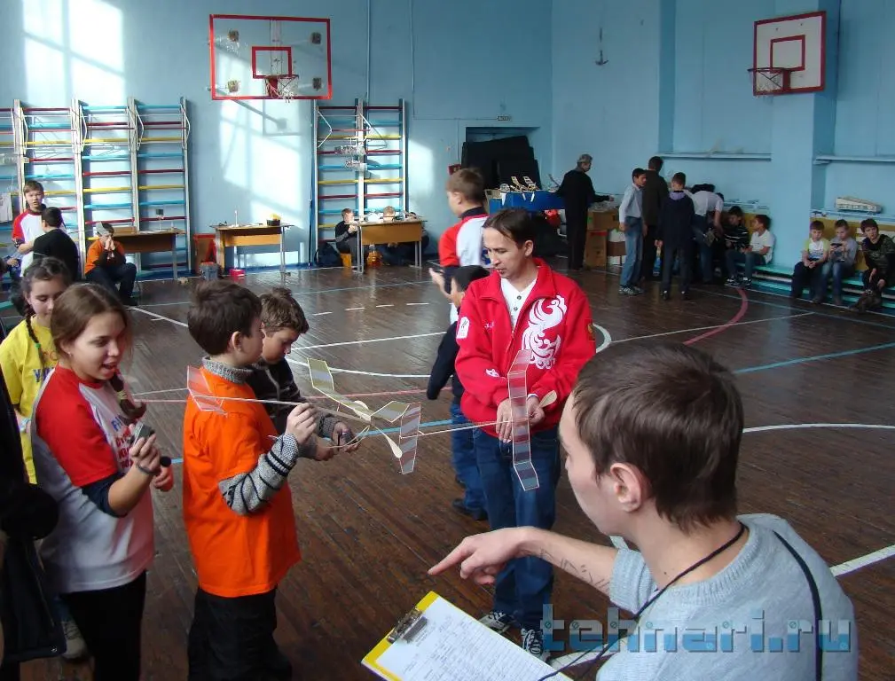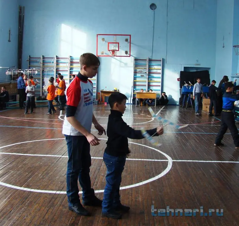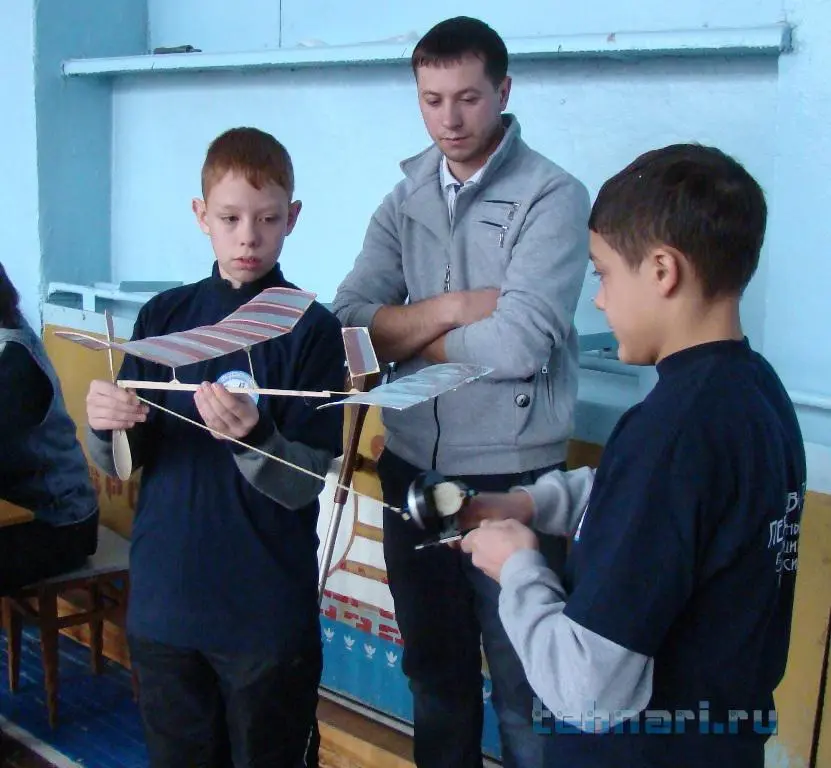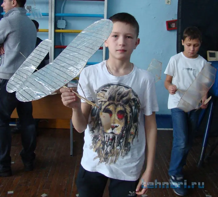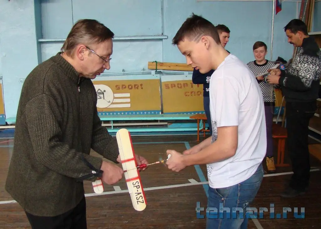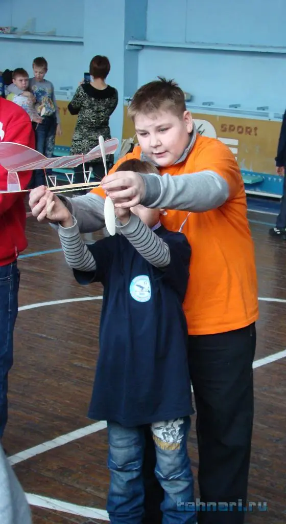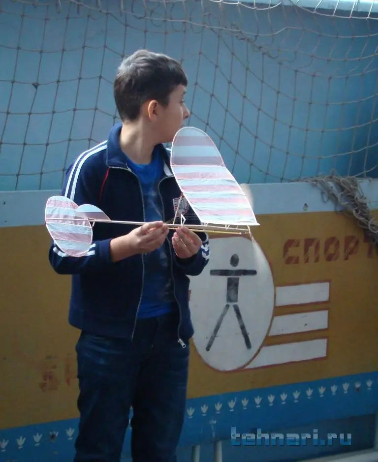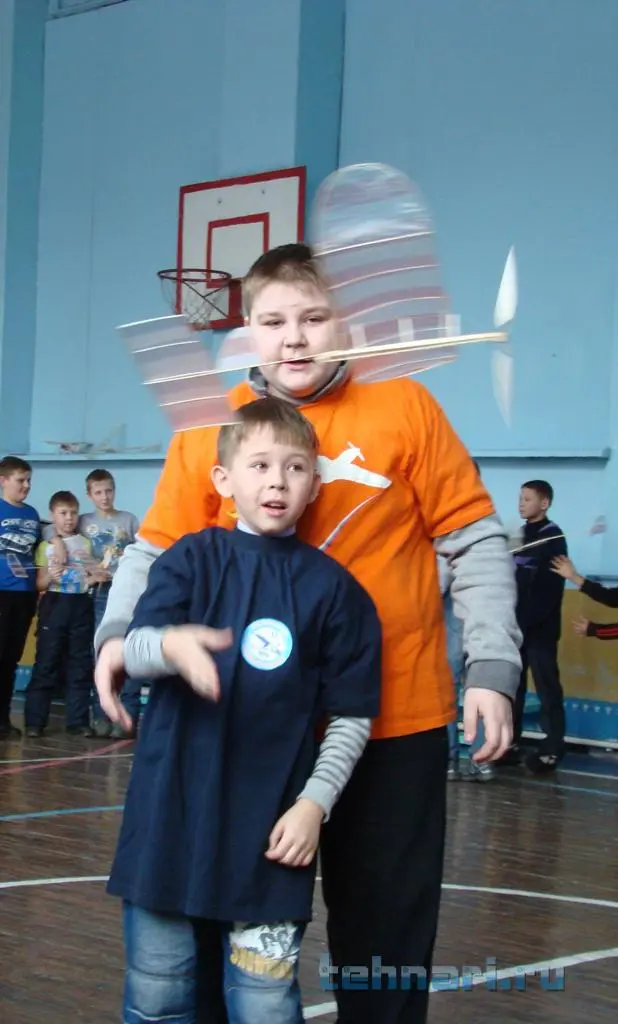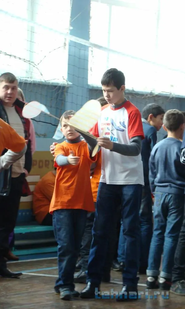 А вот и большие авиамодели с более мощными резиномоторами. Для их управления приходится применять удилища и стек, поскольку высоты и ширины спортзала им явно недостаточно.