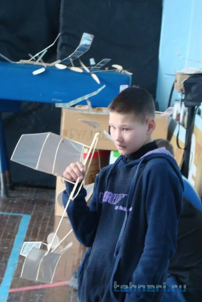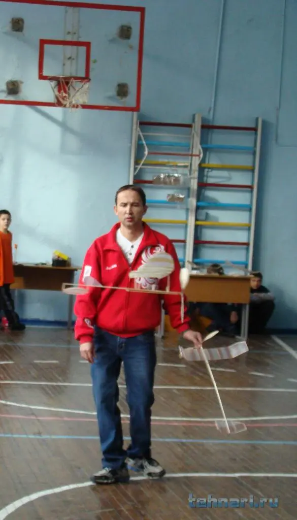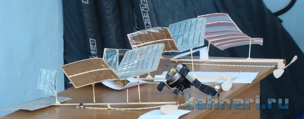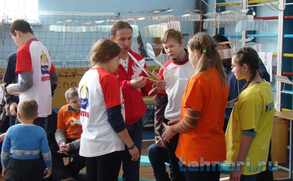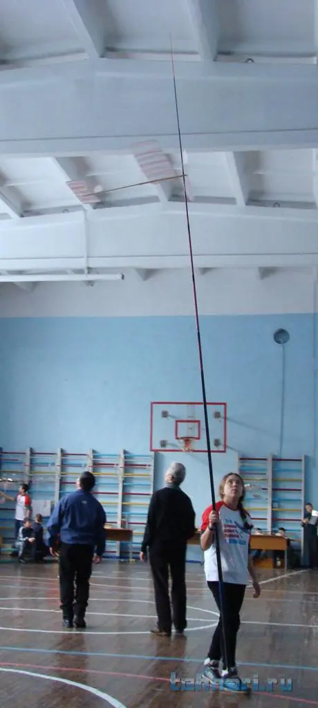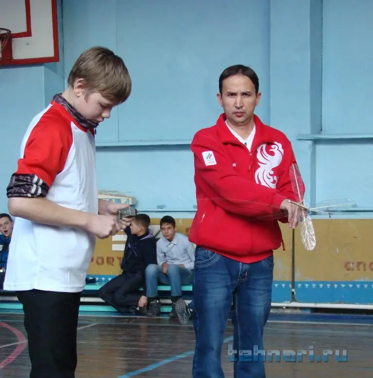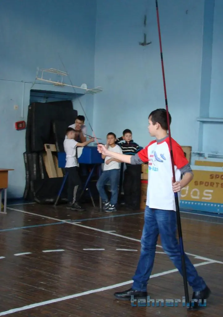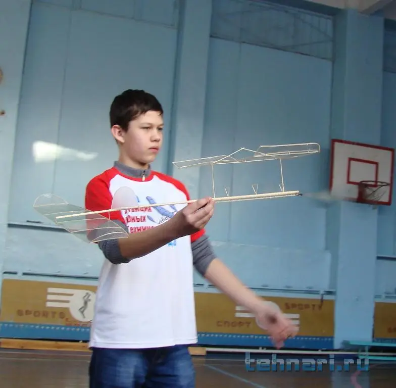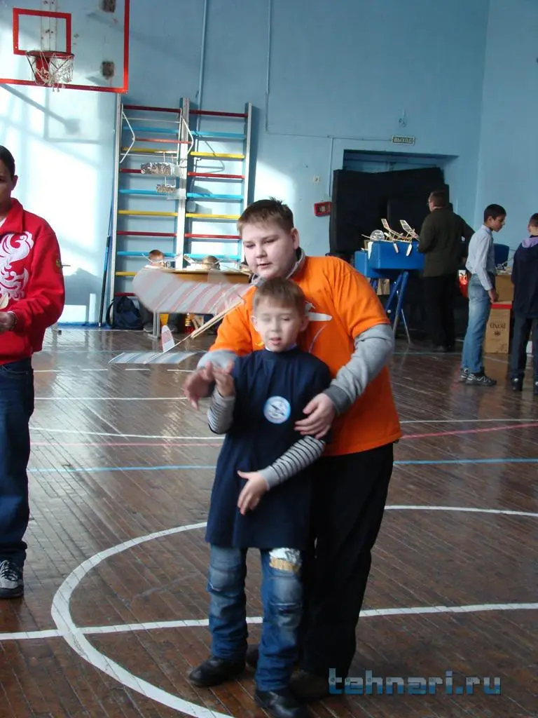 А вот и большие авиамодели с более мощными резиномоторами. Для их управления приходится применять удилища и стек, поскольку высоты и ширины спортзала им явно недостаточно.